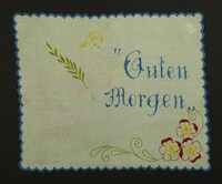 Deckchen für Nachttisch rosa, grün, weiß, gelb, blau, rot bestickt; Plattstich; mit blauen Schlingstich eingefasst; Engelmotiv und Blumenmotiv; Spruch: " "Guten / Morgen" " -
