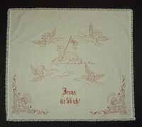 Wandbehang Religiöses Spruchtuch; rot bestickt; mit Spitze eingefasst; Engel, Lamm; Spruch: "Jesus, / dir leb' ich!" -