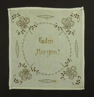Deckchen für Nachttisch in zwei Brauntönen gestickt; in den Ecken Rosen; Hohlsaum; Spruch: "Guten Morgen!" -