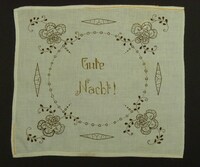 Deckchen für Nachttisch in zwei Brauntönen gestickt; in den Ecken Rosen; oben, rechts und unten umgenäht; z.T. mit orangem Garn festgeheftet; Spruch: "Gute / Nacht!" -