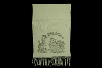 Handtuch schwarz bestickt; Katze in einem Korb, zwei Enten und ein Vogel auf einem Zweig sitzend; mit geknüpften Fransen; Spruch: " Dobré jitro!" ("Guten Morgen!") -