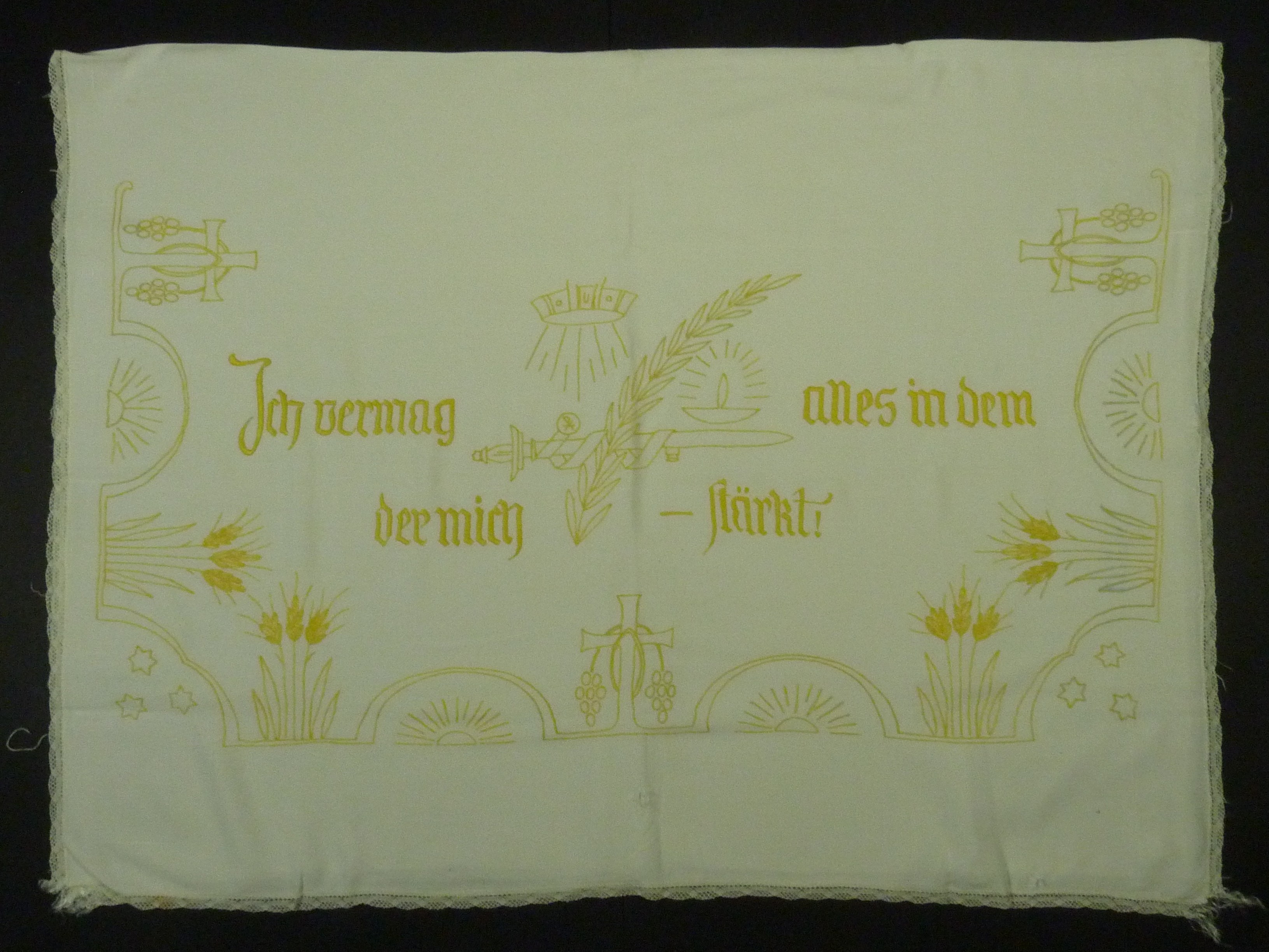 Weißes Versehtuch mit gelber Stickerei. Gestickt sind ein Kreuz, Sonnen, Sterne, Ähren, ein Schwert, eine Krone und dieser Text: "Ich vermag alles in dem der mich - stärkt!" Das Tuch ist nur auf einer Häfte bestickt. Außerdem ist runderhum eine weiße Spitze angenäht. Das Tuch ist in schlechtem Zustand, da es einige Löcher hat, die Spitze beschädigt ist und das Tuch Löcher hat.