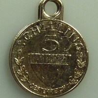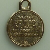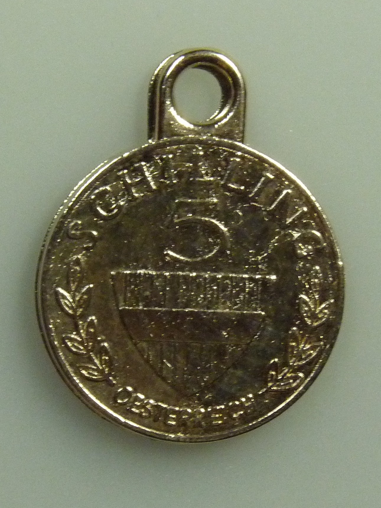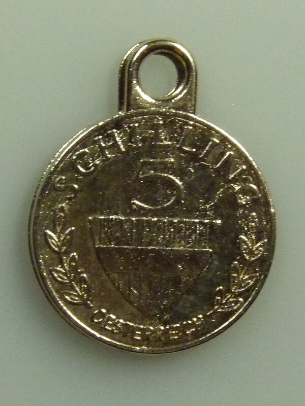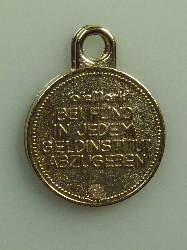 Runder Schlüsselanhänger; auf der einen Seite ist eine 5 Schilling Münze abgedruckt; auf der anderen steht geschrieben: "Safe Mark - Bei Fund in jedem Geldinstitut abzugeben.";