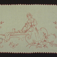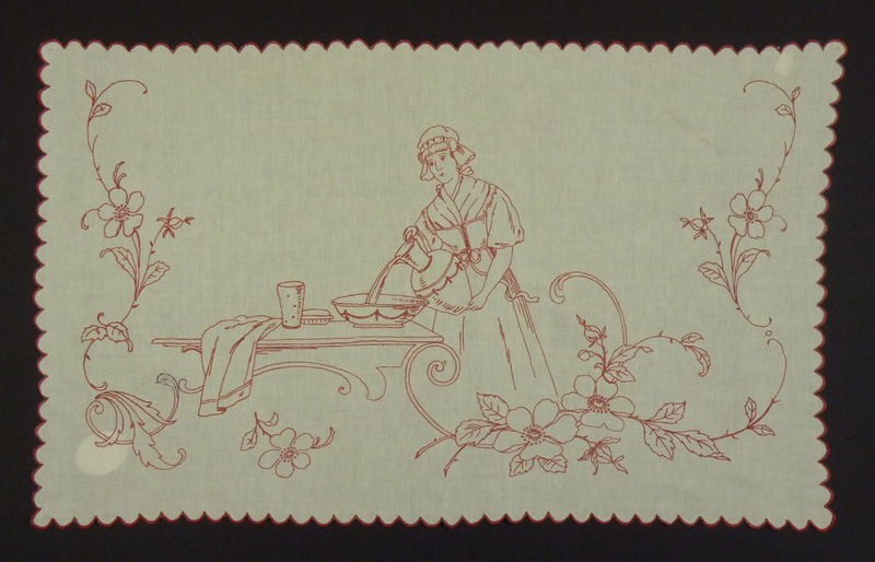 Wandschoner mit Langettenkanten, mit rotem Faden im Stielstich gestickt. Motiv: Frau am Waschtisch, die mit einem Krug Wasser in eine Waschschüssel schüttet. Das Hauptmotiv wird von Blumengirlande umrahmt.