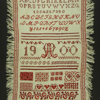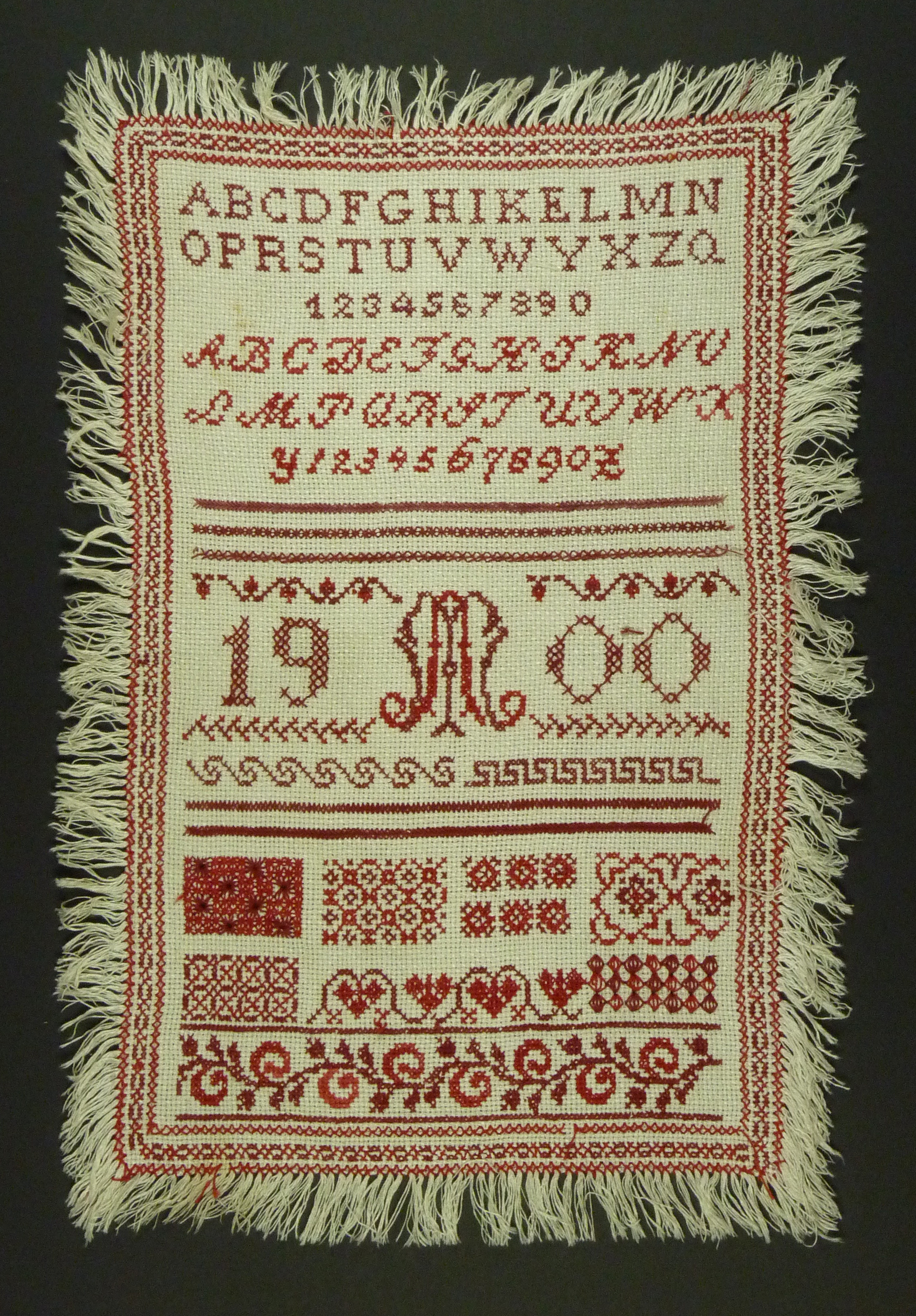 Mustertuch bestickt mit rotem Garn, auf allen Seiten Fransen. Die Motive sind mit Kreuzstich gearbeitet und zeigen: Alphabet in verschiedenen Schriften, Zahlen, verschiedene Muster und Ornamente; in der Mitte: 1900, Initialen AM.