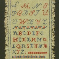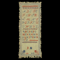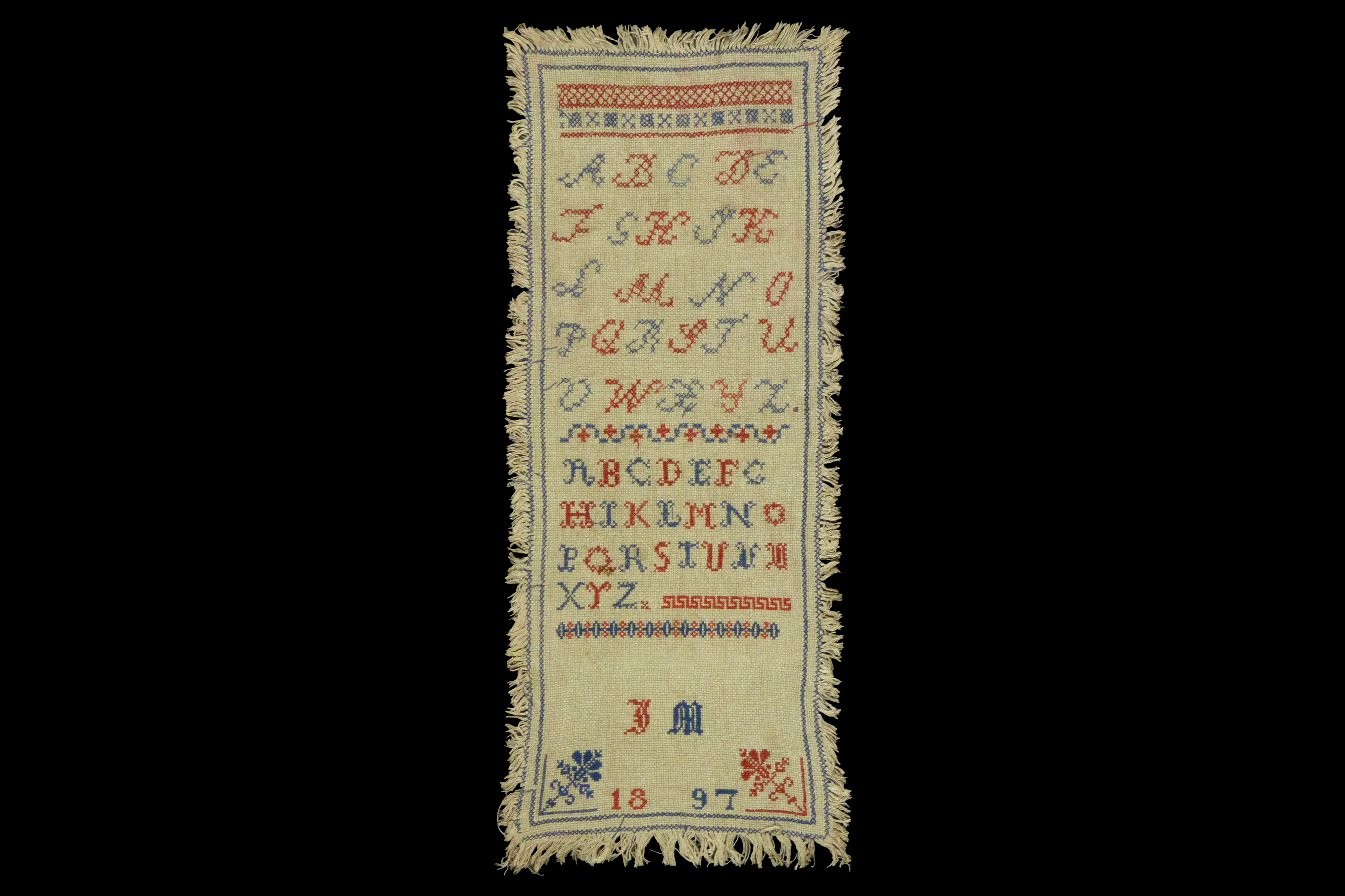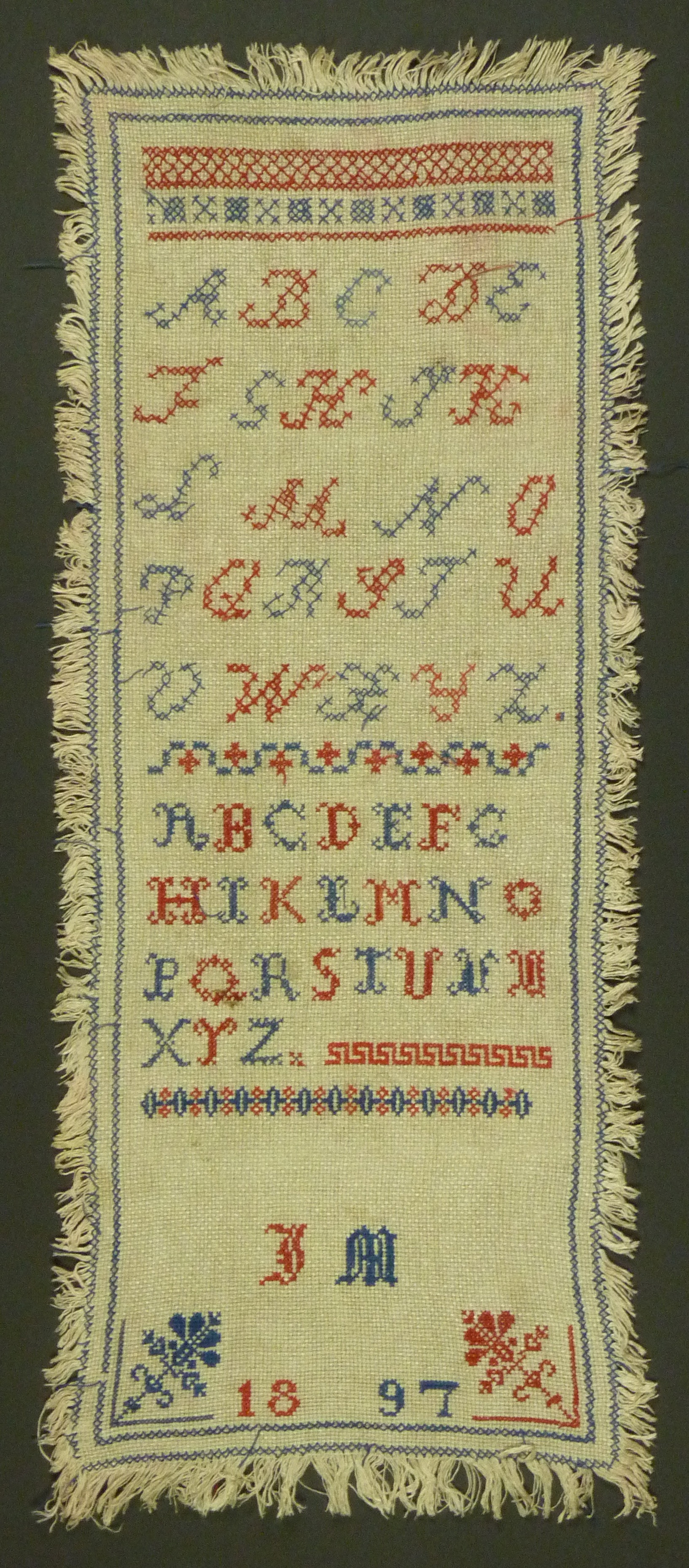 - Mustertuch in den Farben rot und blau bestickt. Es ist auf allen Seiten mit Fransen verziert. Die Motives sind mit Kreuzstich gestickt, teilweise etwas schlampig, und zeigen: Alphabet in zwei verschiedenen Schriften, JM Initialien, 1897.