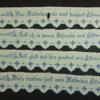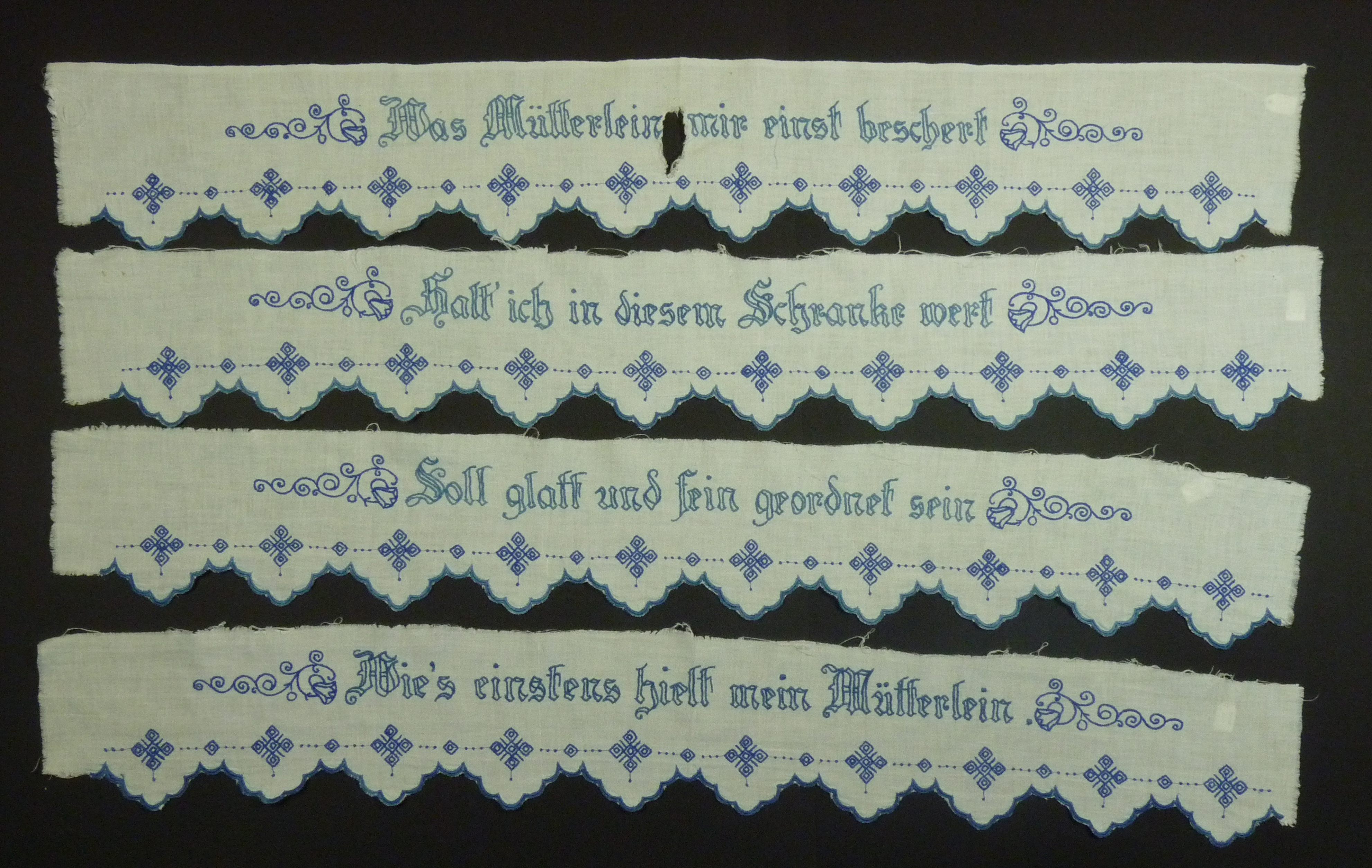 Vier-teiliges Spruchband in zwei verschiedenen Blautönen bestickt. Der unterer Rand ist mit Schlingstich eingefasst. Text: "Was Mütterlein mir einst beschert / Halt ich in diesem Schranke wert / Wie's einstens hielt mein Mütterlein. / Soll glatt und fein geordnet sein". Der Text ist von Ornamenten umgeben. In der Mitte des ersten Bandes befindet sich ein großes Loch.