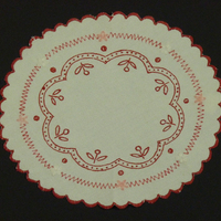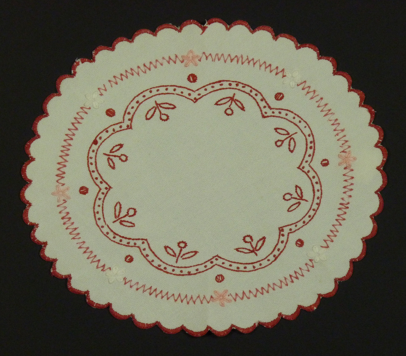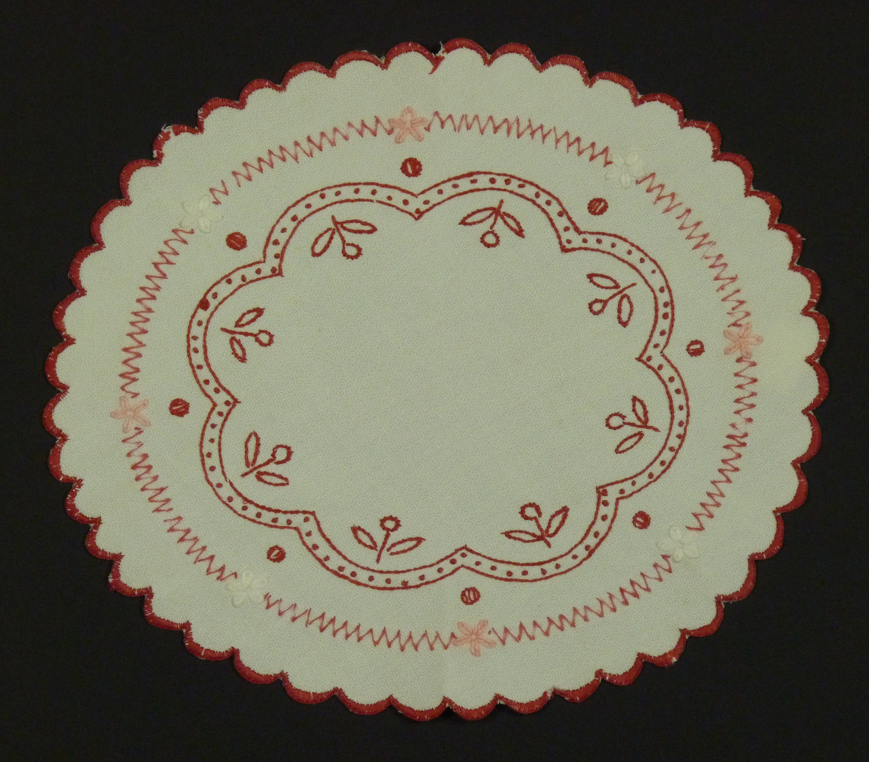 Rot besticktes rundes Deckchen, das mit Schlingstich eingefasst ist. Dargestellt sind unter anderem floralen Motive.