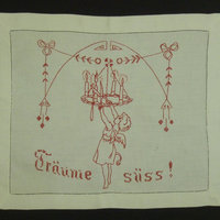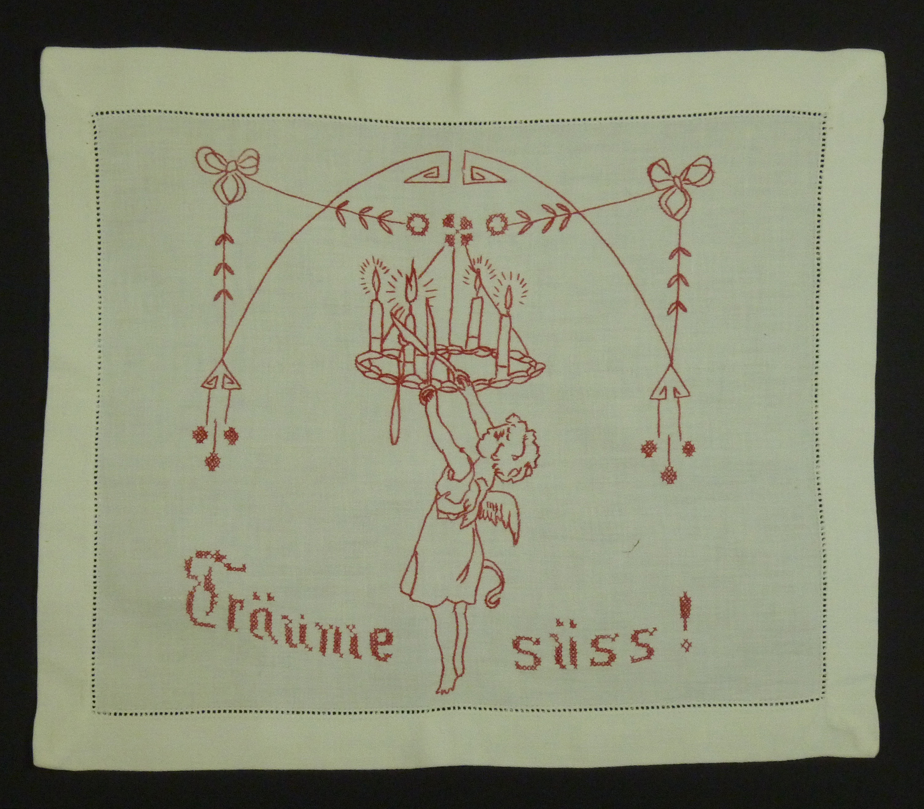 Spruchtuch mit rotem Faden bestickt. Das Motiv zeigt einen Adventkranz, der in der Mitte des Tuches von einer Girlande herunter hängt. Ein Engel nähert sich mit einer geöffneten Schere einer brennenden Kerze des Adventskranzes. Links von den Beinen des Engels steht "Träume" und rechts davon "süss!". Das gesamte Motiv wird von einem Hohlsaum eingefasst.