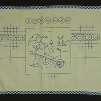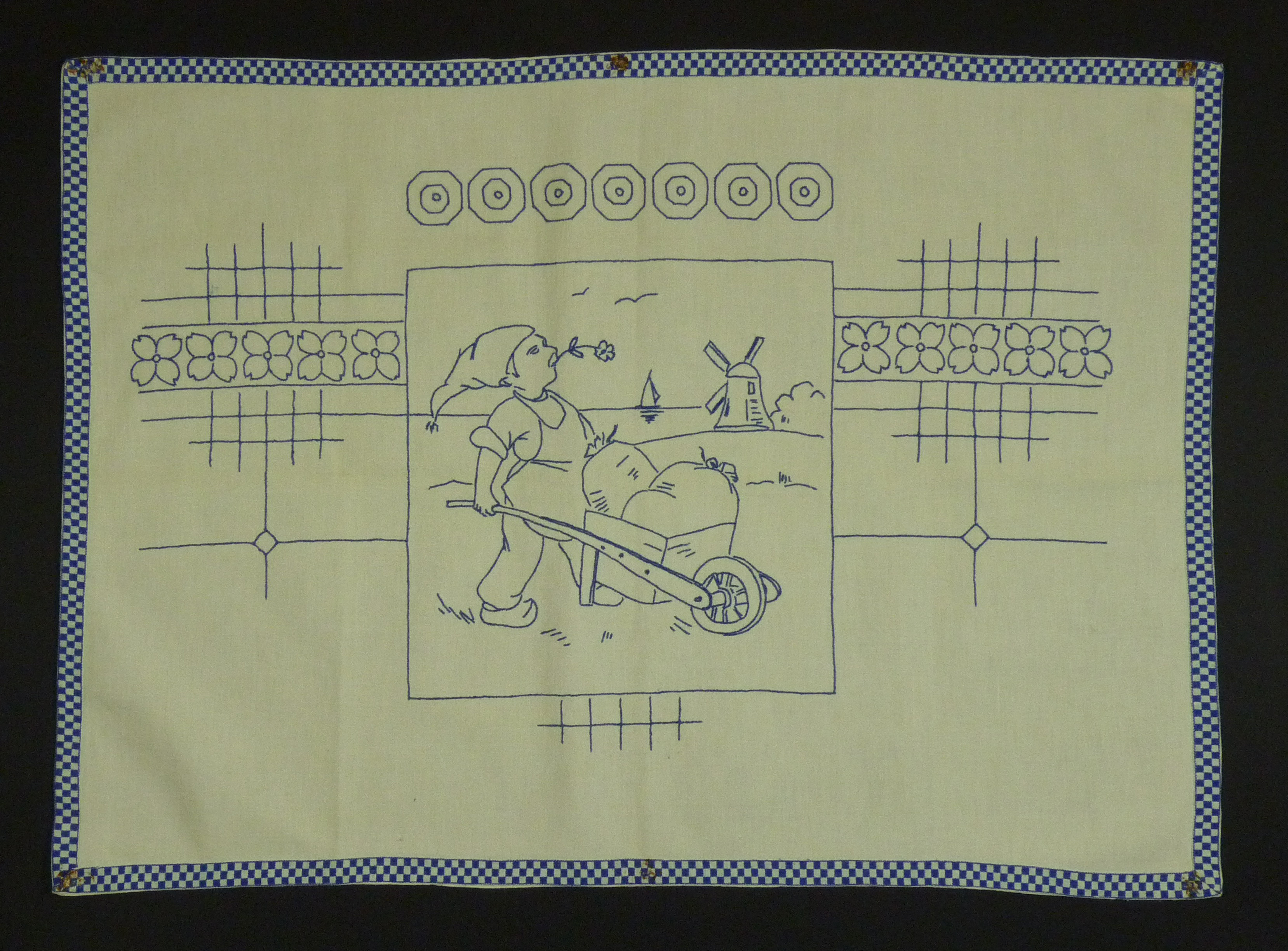 Blau gestickter Wandschoner, der mit einem blauen Band eingefasst ist. Motiv in der Mitte des Tuches, umgeben von verschiedenen Blumen- und Strichmustern. Hauptmotiv: Im Vordergrund ist ein Zwerg zu sehen, der einen Schubkarre, beladen mit zwei Säcken, schiebt. Er trägt einen Zipfelmütze und hat eine Blume aus dem Mundwinkel hängen. Im Hintergrund ist eine Windmühle zu sehen, die an einem See oder Fluß steht, auf dessen Horizont ein Segelboot erkennbar ist.