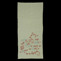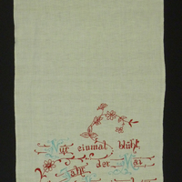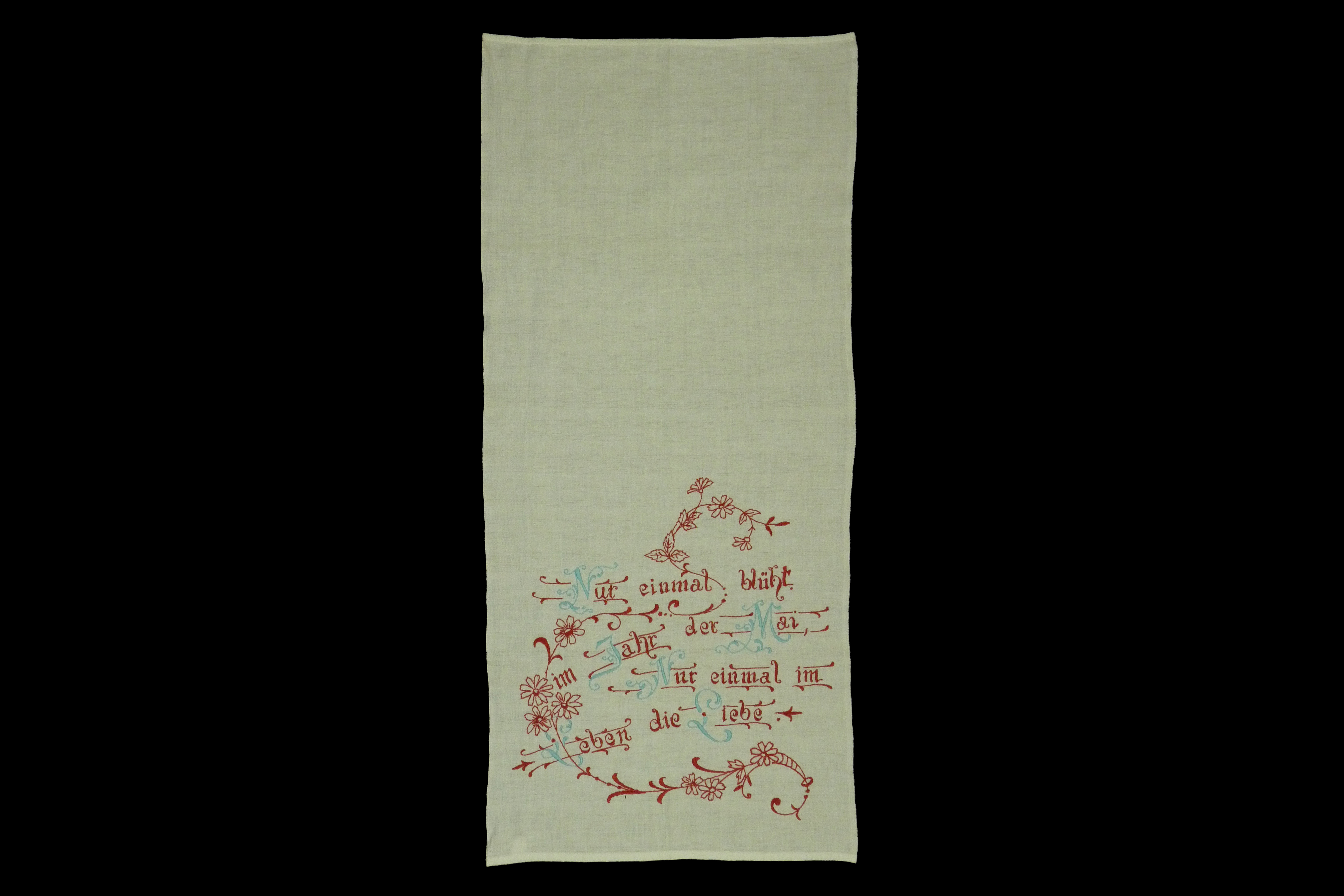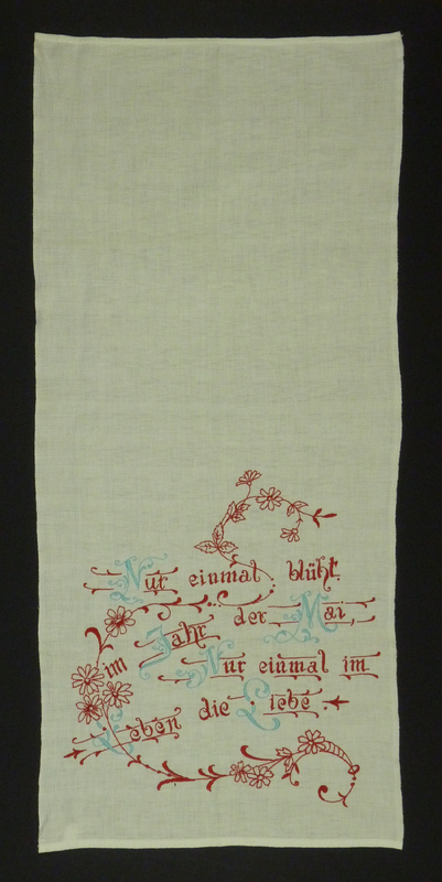Die untere Hälfte des Handtuchs mit einem Spruch mit rotem Faden bestickt, wobei die Großbuchstaben jeweils blau sind. Spruch "Nur einmal blüht / im Jahr der Mai, / Nur einmal im / Leben die Liebe". Um den Spruch schlängeln sich florale Girlanden.