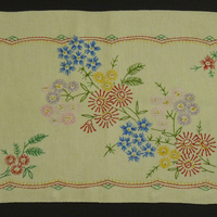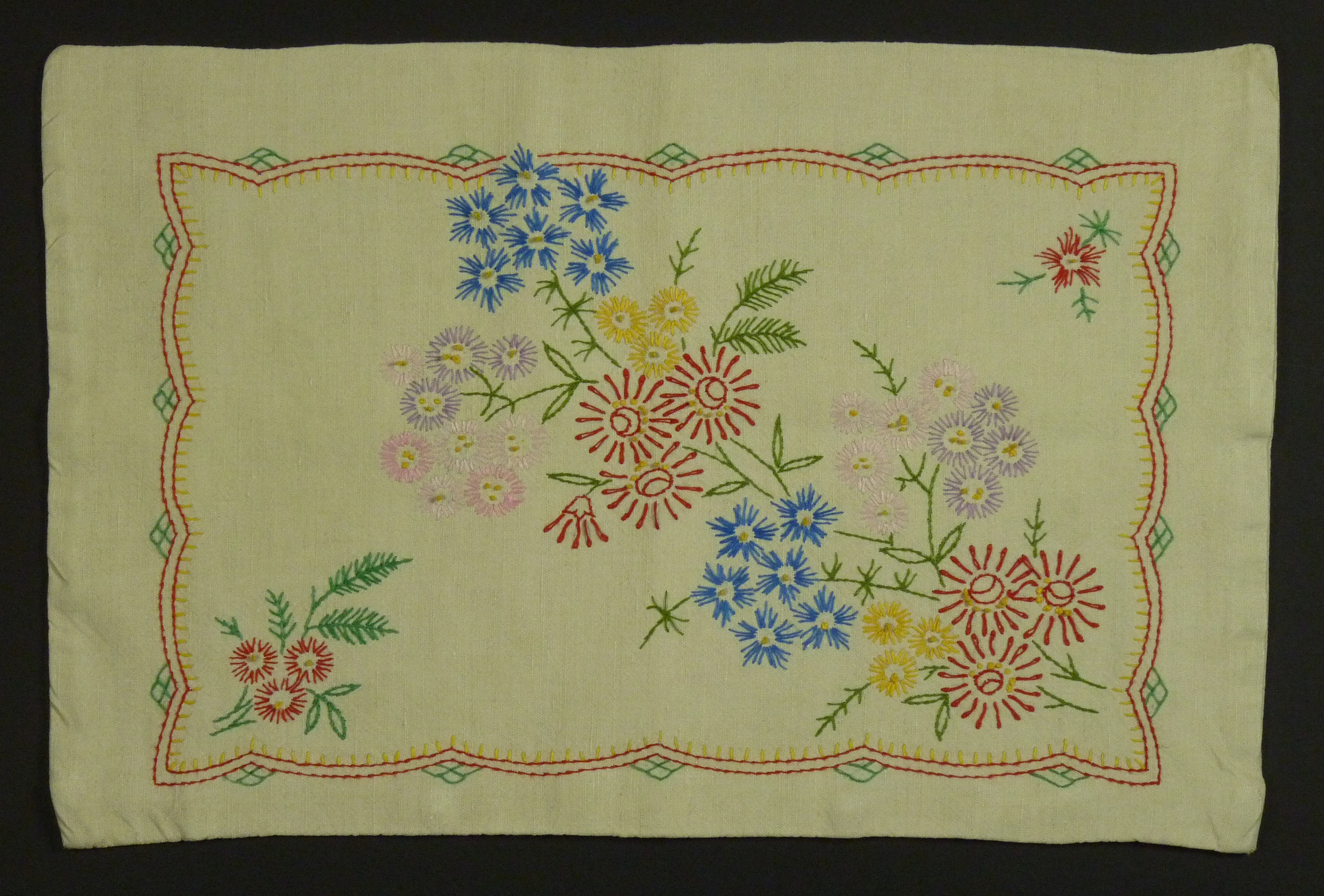 Bunt bestickter Kissenbezug, der mit Stielstich bestickt ist. Dargestellt sind verschiedene Blumen in Rot, Blau, Rosa, Gelb, Lila und Grün. Diese Blumen sind von einem Zierband eingefasst.