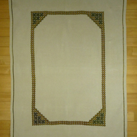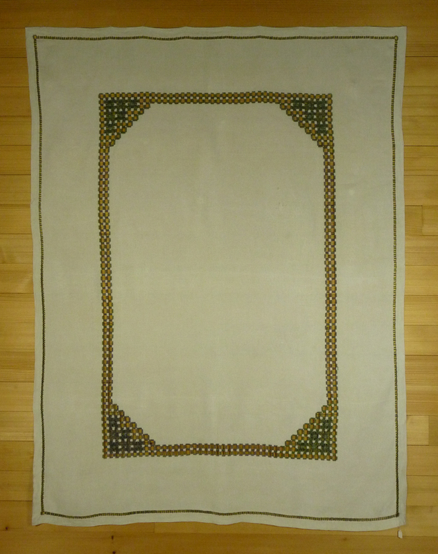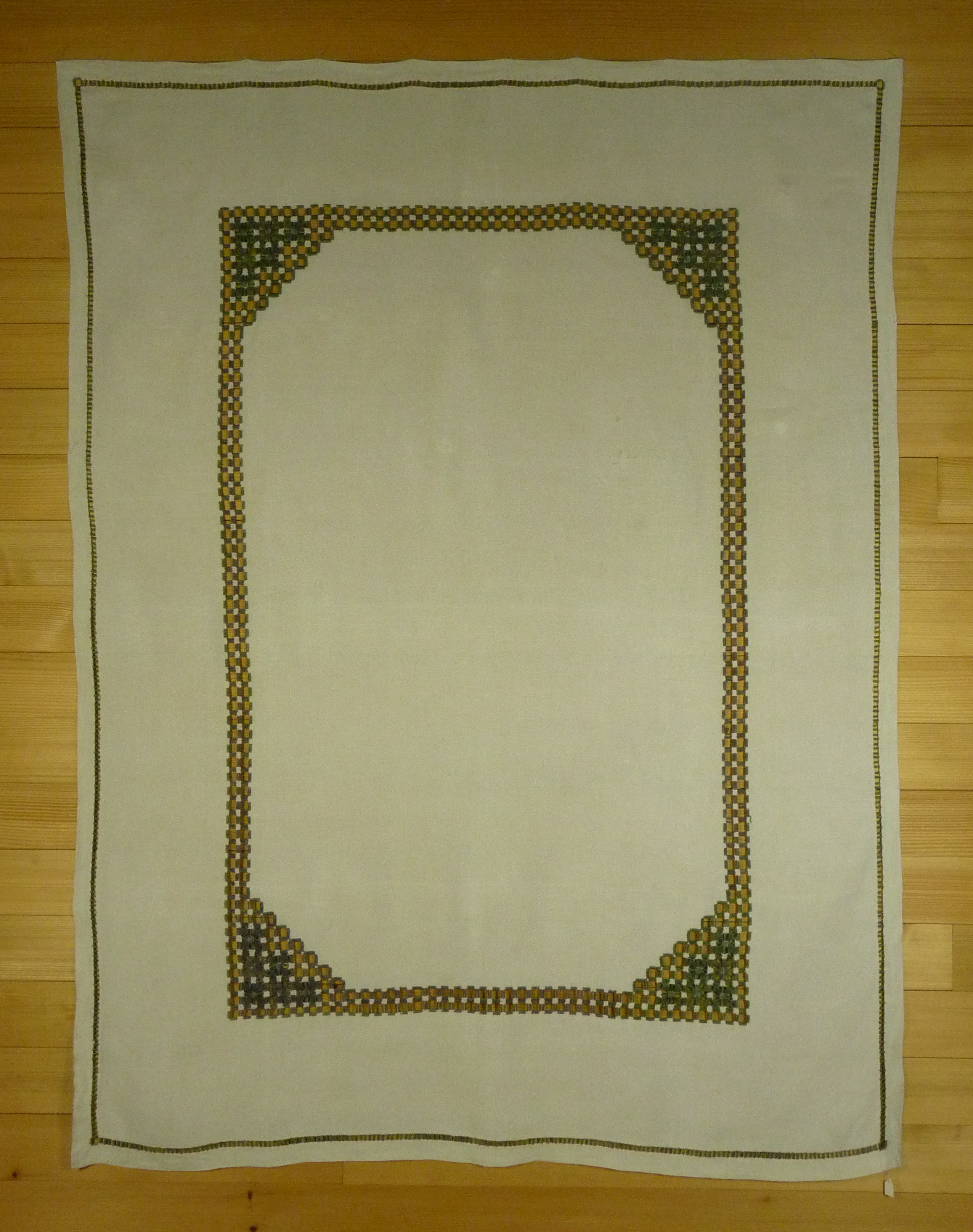 - Tischdecke in dunklem weiß mit zwei Zierrahmen aus Handangerarbeit. Der innere Rahmen ist an den Ecken breiter. Gefertigt mit grünem und braunem Garn.