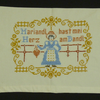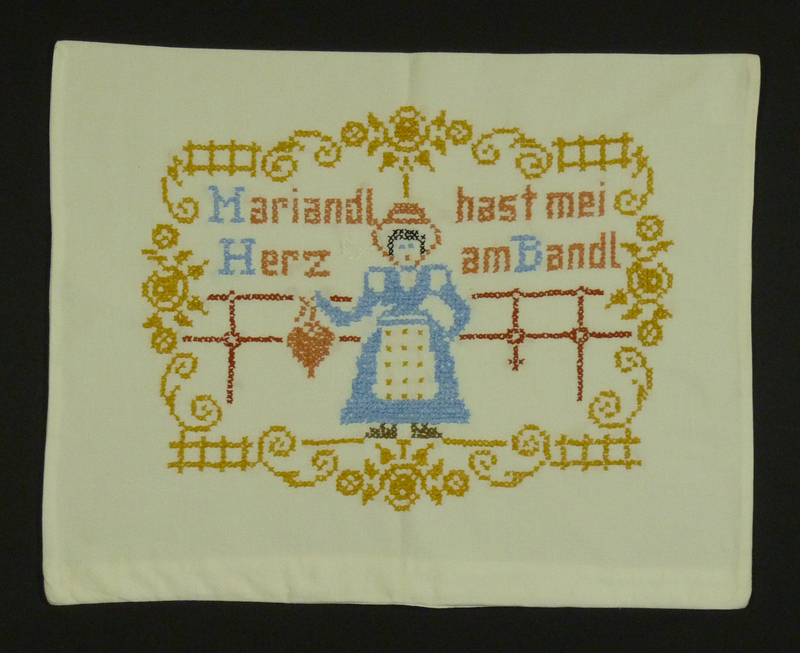 Bunt bestickter Kissenbezug. Die dargestellten Motive sind mit Kreuzstich gestickt und zeigen Zierranken, die eine Frauenfigur einrahmen. Die frontal stehende Frau hält in ihrer rechten Hand ein Band, an dem ein Herz hängt. Rechts und links der Figur steht der Spruch: "Mariandl hast mei / Herz am Bandl".