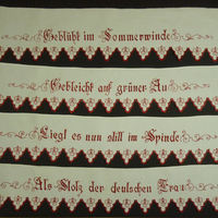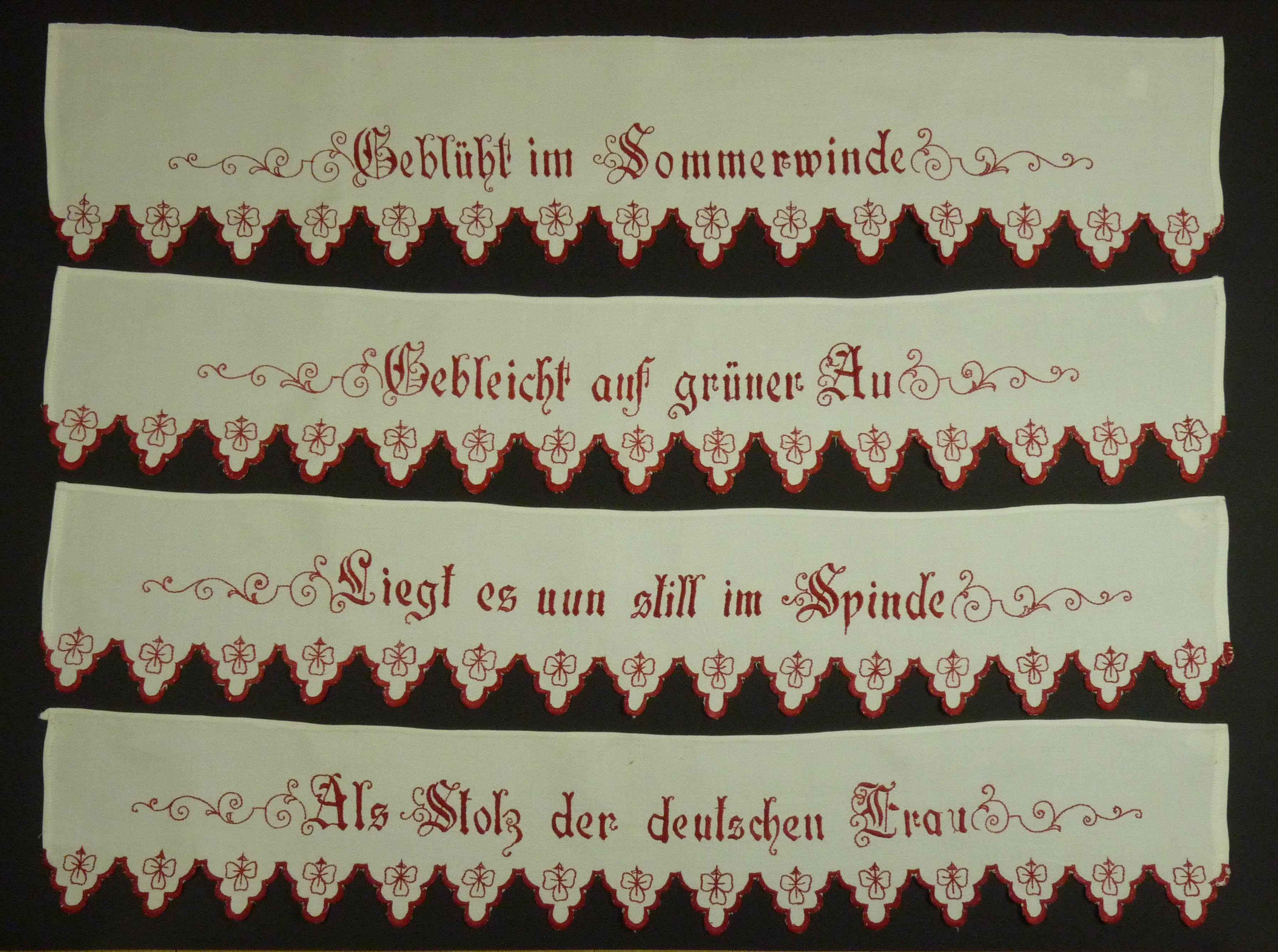 Vier-teiliges Spruchband mit rotem Garn und unten einem bogenförmigen Abschluss mit Feston. Auf den vier Teilen befinden sich jeweils florale Verziehrungen und es steht jeweils ein Abschnitt des Spruches: "Gebleicht im Sommerwinde / Gebleicht auf grüner Au / Liegt es nun still im Spinde / Als Stolz der deutschen Frau".