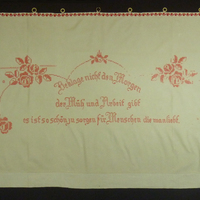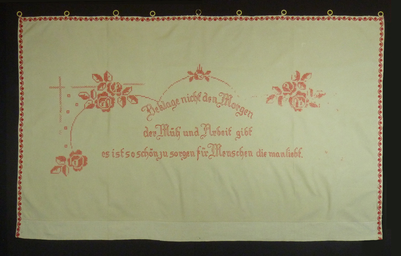 Rot bestickter Wandbehang, mit Zierband eingefasst. An der Oberkante des Tuches sind Ösen, die zum Aufhängen dienen, angebracht. Die Motive sind mit Kreuzstich und Stielstich gestickt. Dargestellt sind Blumenornamente und der Spruch: "Beklage nicht den Morgen/ der Mühe und Arbeit gibt/ es ist so schön zu sorgen für Menschen die man liebt".