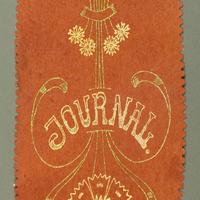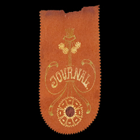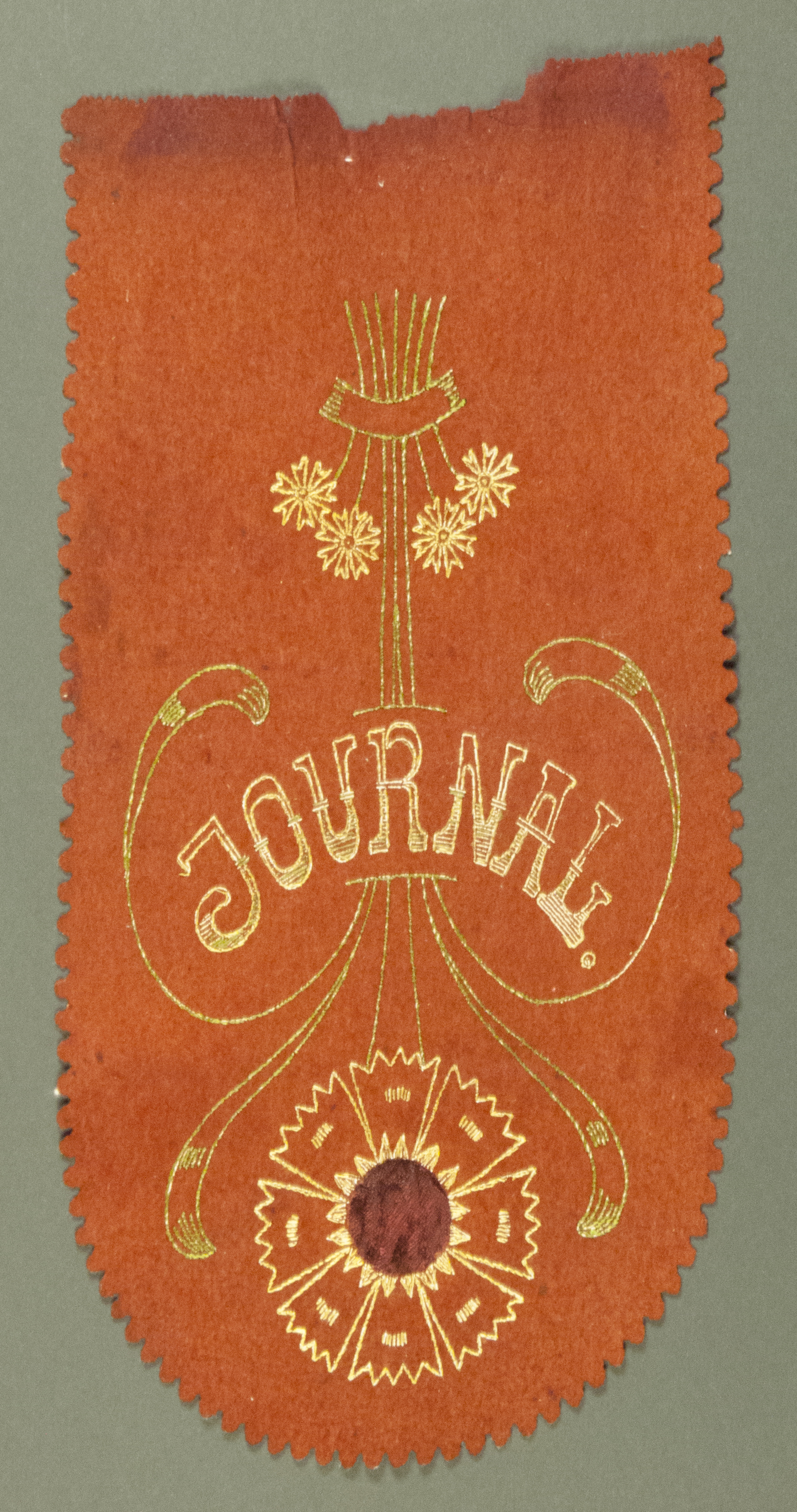 Halbrund abgerundetes Filzband mit gezackten Kanten. Da die obere Kante abgerissen erscheint, kann angenommen werden, dass hier ein Teil fehlt. Dargestellt ist ein florales Motiv. Der mittlere, runde Teil einer Blüte ist ausgeschnitten und mit Stoff unterlegt - Molatechnik. Das Motiv ist mit grünem und gelbem Lurex mitgenäht. In der Mitte des Bandes ist der Schriftzug "Journal" eingestickt. Der Verwendungszweck ist unklar.
