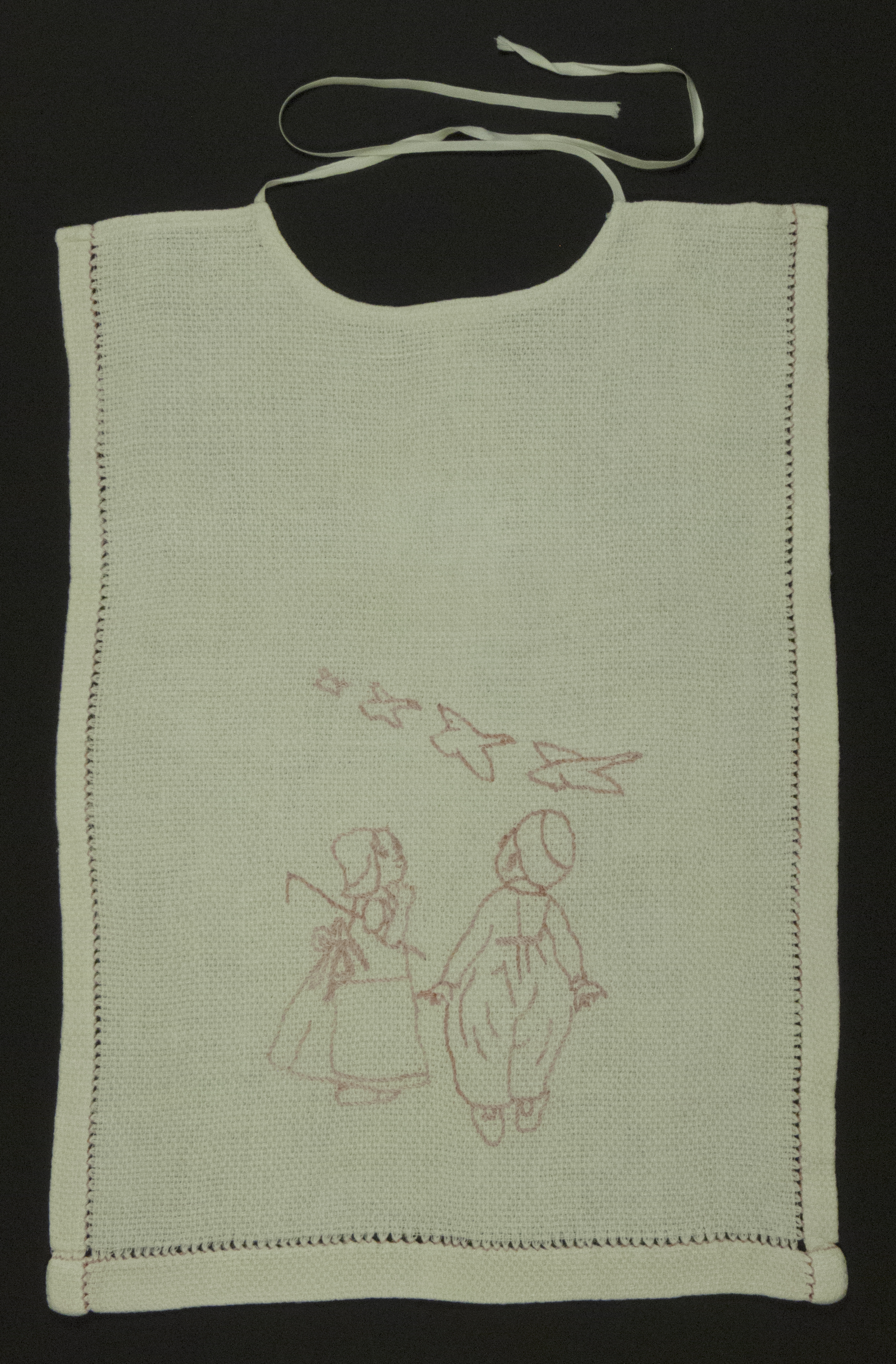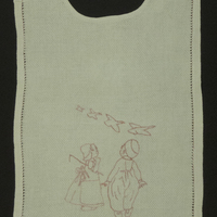 Rot bestickter Latz, der mit einem Hohlsaum eingefasst ist. Das gestickte Motiv zeigt ein Mädchen und einen Buben. Die beiden schauen, mit dem Rücken zu den BetrachterInnen gewandt, den Vögeln beim Fliegen zu.