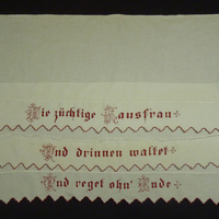 Dunkelrot, hellrot und weiß bestickte Spruchbänder. Zwei der Bänder sind oben mit einem weißen Stoff verlängert worden. Gestickt mit verschiedenen Techniken: Kontur der Schrift in Stielstich, Füllung in Zweigstich und die Bänder sind mit Schlingstich eingefasst. Die Anfangsbuchstaben der Schrift sind jeweils mit weißem Garn gefüllt und verziert. Auf den drei Bändern steht jeweils ein Teil des Spruches: "Und drinnen waltet / Die züchtige Hausfrau / und reget ohn' Ende".