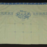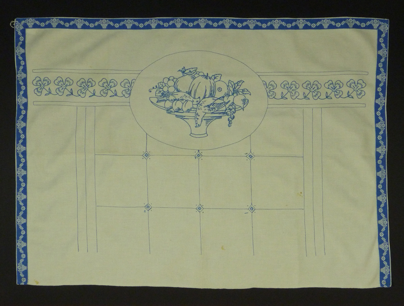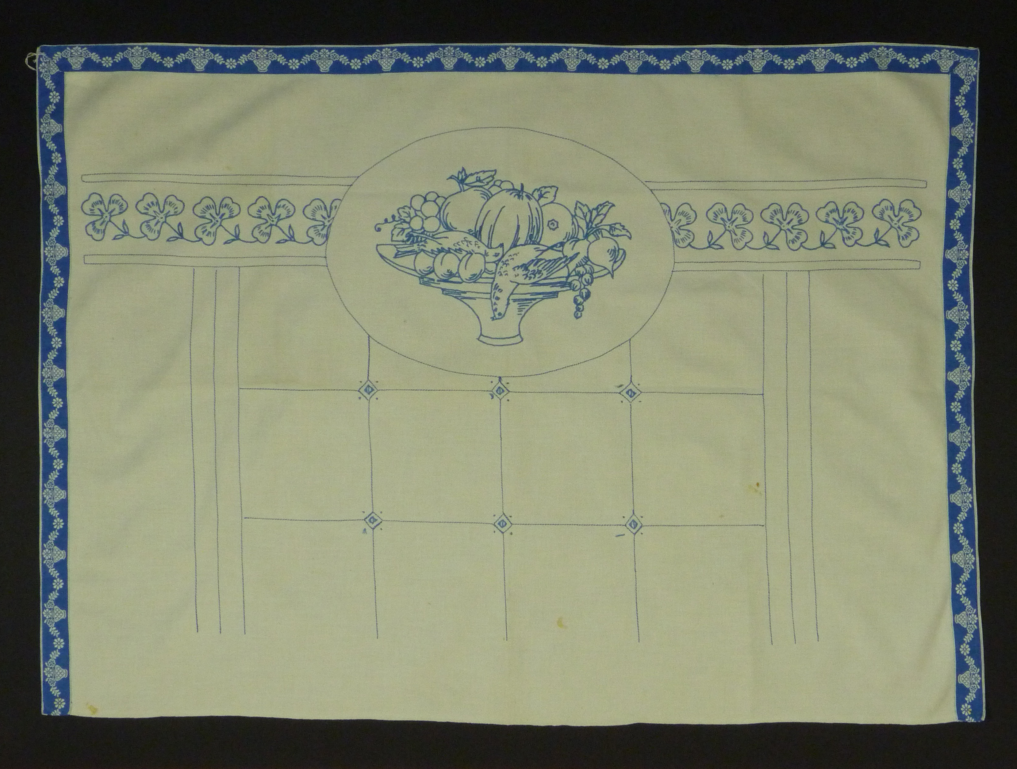 - Blau bestickter Wandbehang. Das Tuch ist oben, links und rechts mit einem blauen Zierband eingefasst. Dargestellt sind ein Früchtekorb, Blumen und Ornamente.