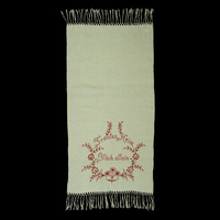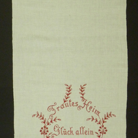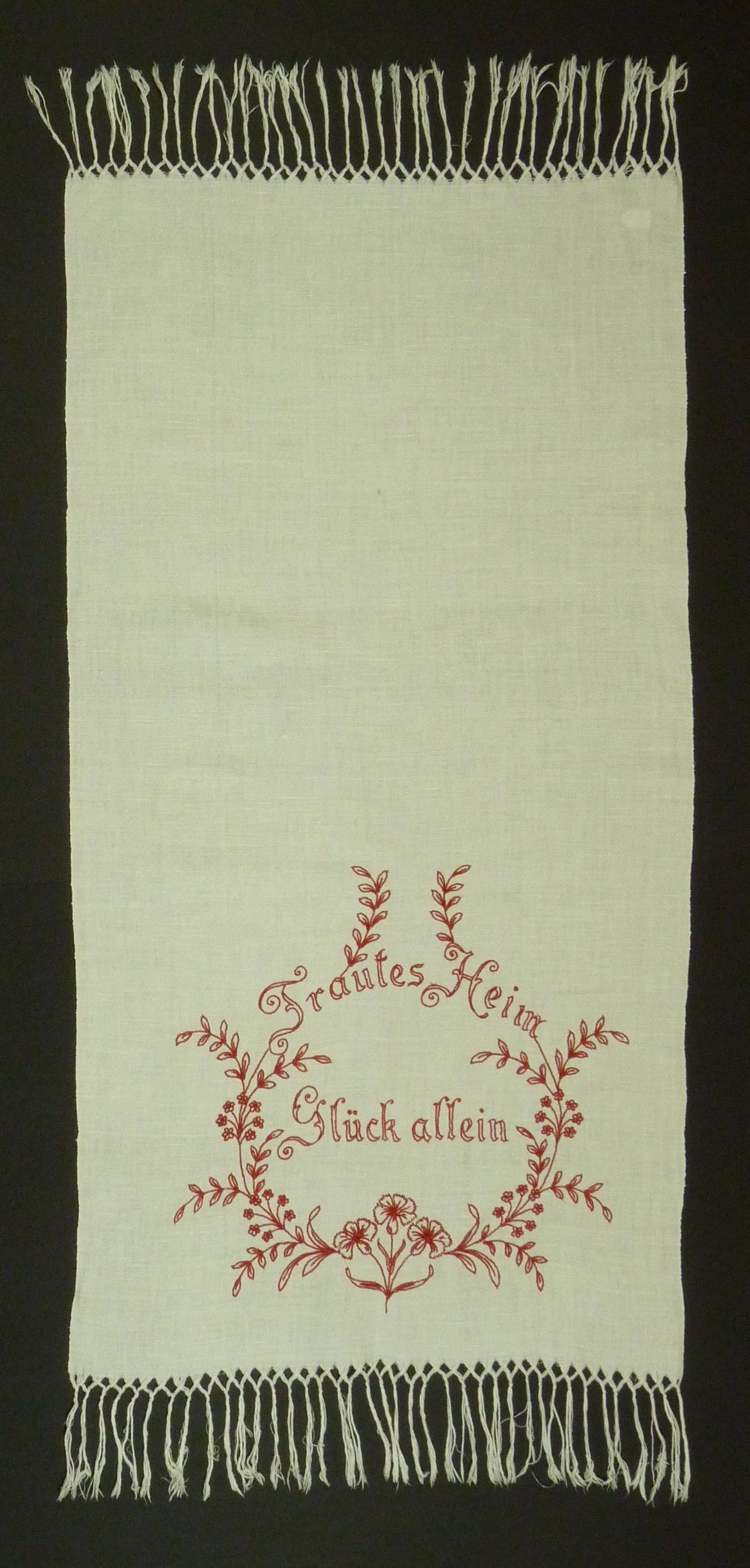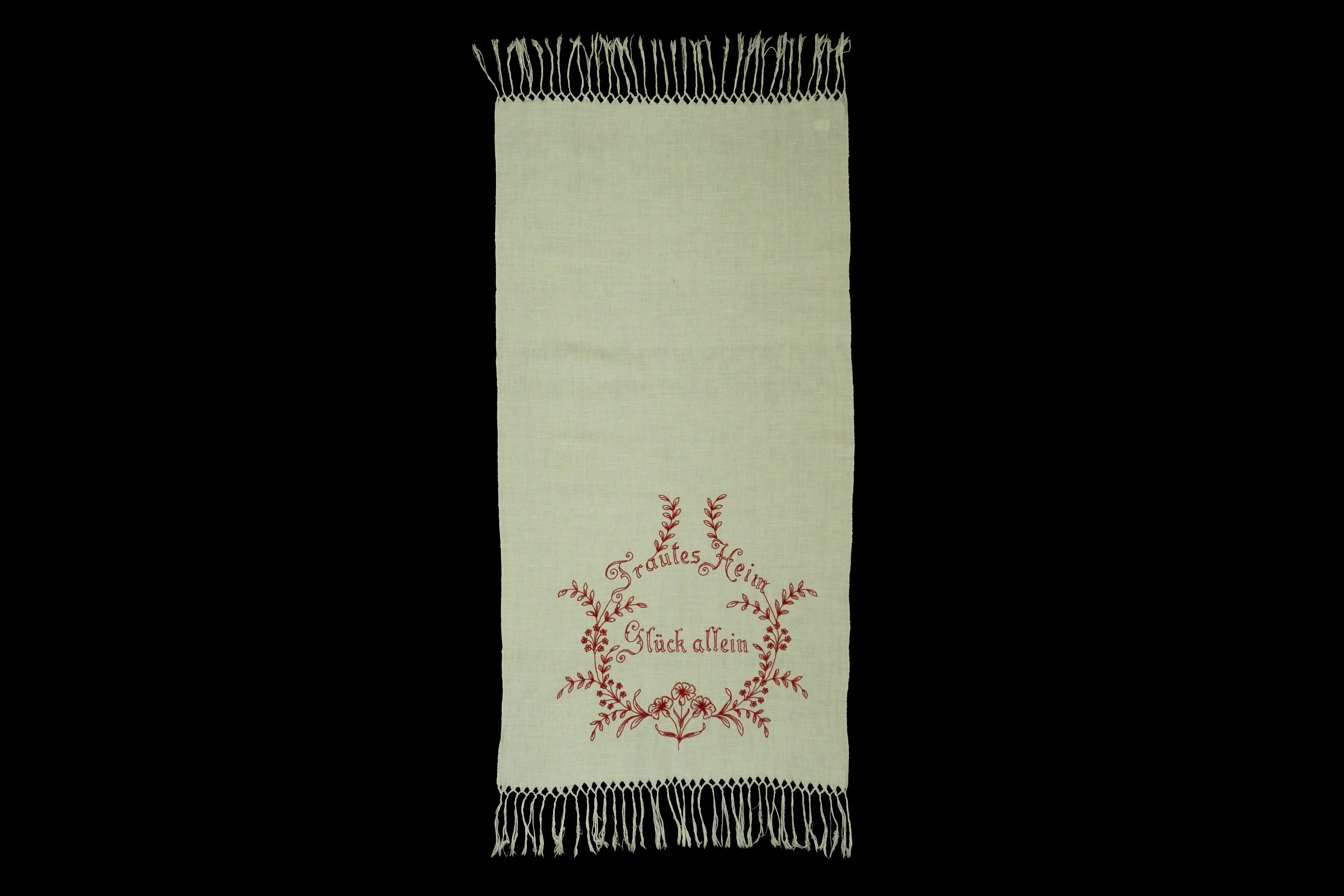 Rot besticktes Überhandtuch, mit Fransen eingefasst. In der unteren Hälfte steht der Spruch: "Trautes Heim / Glück allein", der von runden, floralen Ranken umfasst ist.