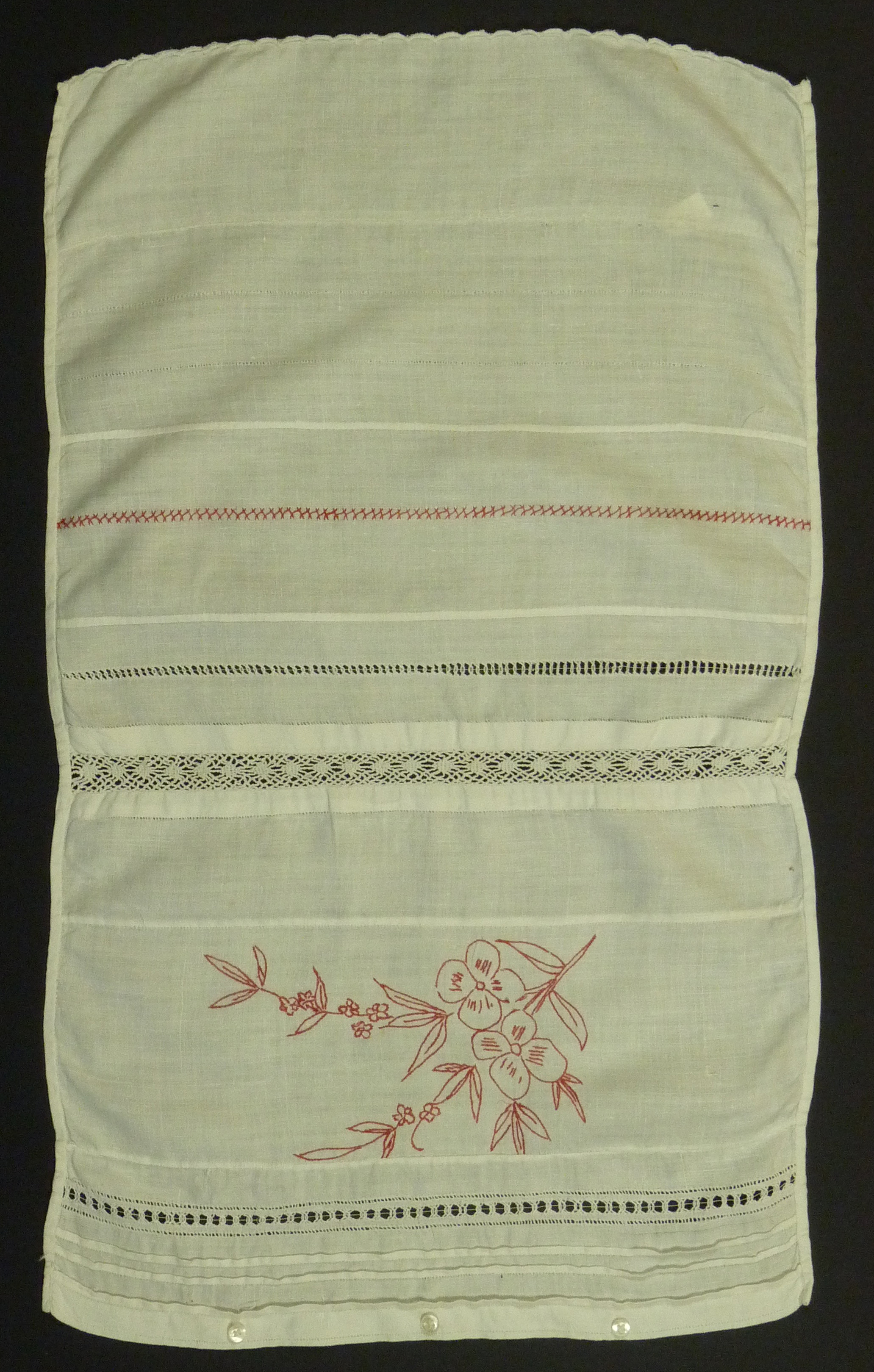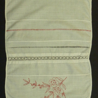 - Mustertuch mit verschiedenen Stichen aus rotem Garn. Das Tuch hat oben eine bogenförmige Kante mit Feston. Das Tuch zeigt verschiedene Nähte, verschiedene Hohlsäume, Kreuzstich und eine Blumenranke. An der unteren Kante sind drei Knöpfe angenäht.