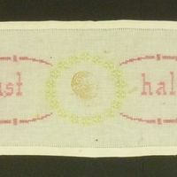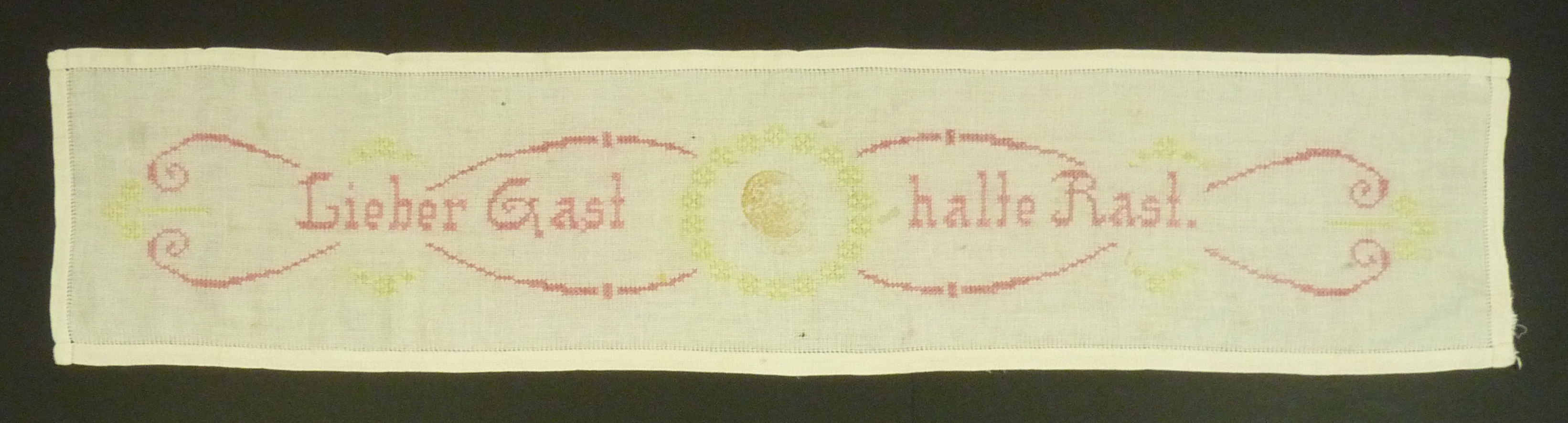 - Rosa und hellgrün bestickter Wandbehang. Mit Kreuzstich ist der Spruch gestickt: "Lieber Gast halte Rast." Um den Spruch sind Ziergirlanden gestickt. Das Motiv ist in der Mitte nicht fertiggestickt, aber die Vorlage ist noch sichtbar.