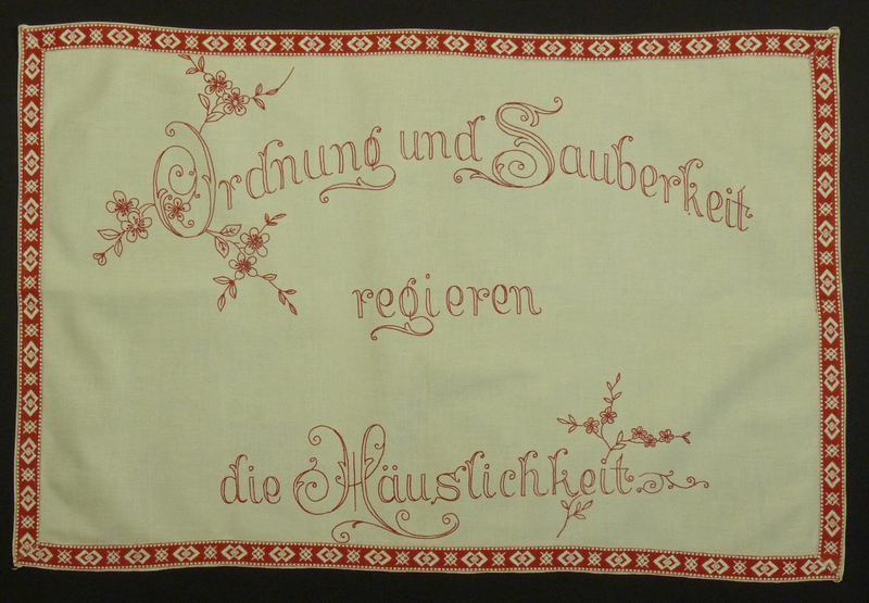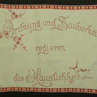 - Rot bestickter Wandbehang, der mit einem roten Zierband eingefasst ist. Das Motiv ist mit Stielstich gestickt und ist der Spruch: "Ordnung und Sauberkeit / regieren / die Häuslichkeit", der mit feinen Blumenranken verziehrt ist.