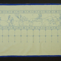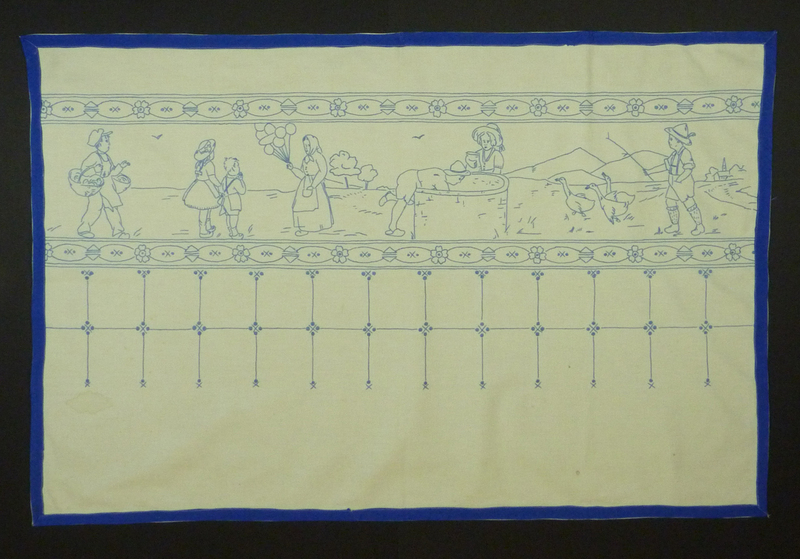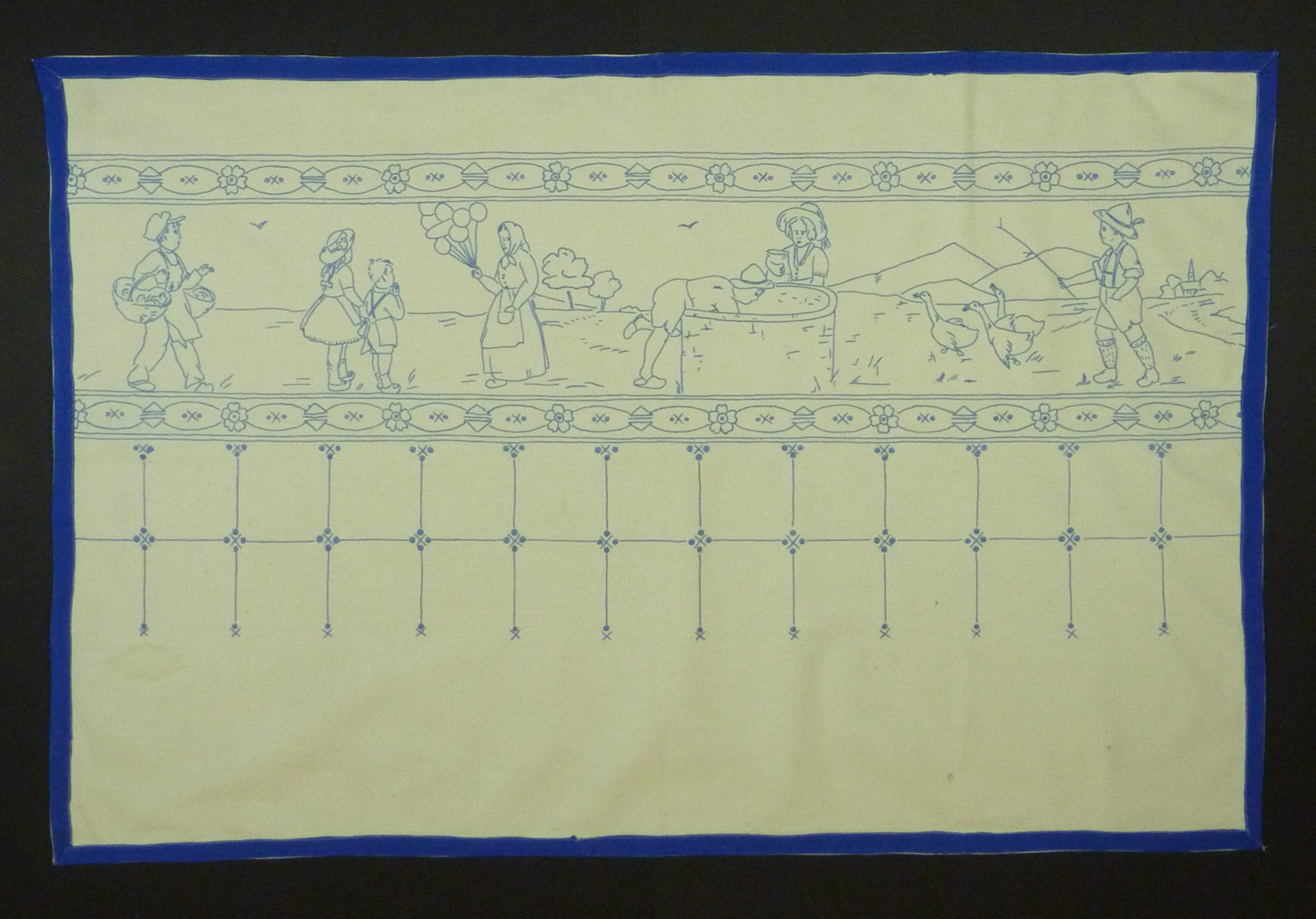 Blau bestickter Wandbehang, der mit einem blauen Band eingefasst wird. Das Motiv zeigt einen Hirten mit Gänsen, eine Frau und einen Mann am Brunnen, eine Frau mit Luftballons, Kinder, die diese Frau betrachten und einen Mann, der zwei gefüllte Körbe in der Hand hat.