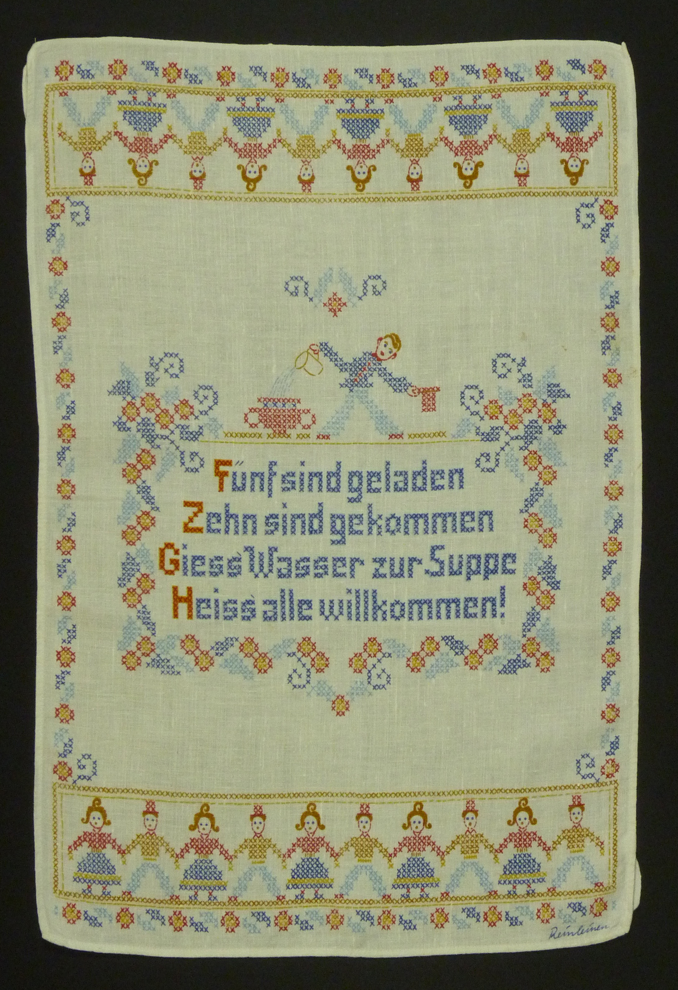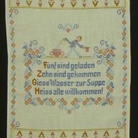 Spruchtuch in Kreuzstich-Optik, mit vier Farben bedruckt. Der Zierrahmen besteht aus Blumen und Figuren. In der Mitte befindet sich ein Spruch: "Fünf sind geladen / Zehn sind gekommen / Giess Wasser zur Suppe / Heiss alle willkommen!" Um den Spruch befinden sich Blumengirlanden und die Darstellung einer Person, die Wasser in einen Suppentopf gießt.