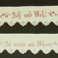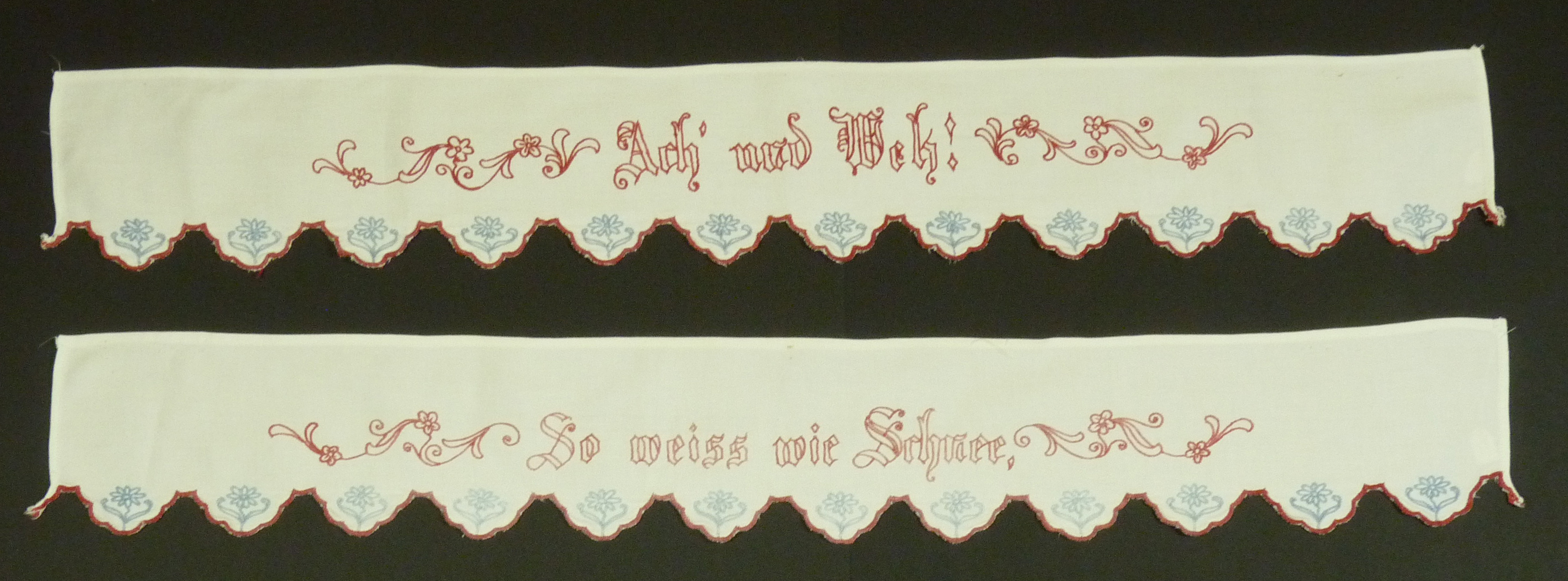 Zweiteiliges rot und blau besticktes Spruchband. Der untere Rand ist gerundet und mit Schlingstich eingefasst. In den Rundungen befindet sich jeweils ein Blumenmuster. Auf beiden Bändern befindet sich jeweils ein Teil des zusammengehörenden Spruches, der links und rechts von floralen Verziehrungen eingefasst wird: "So weiß wie Schnee, / Ach’ und Weh!"