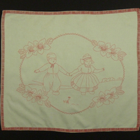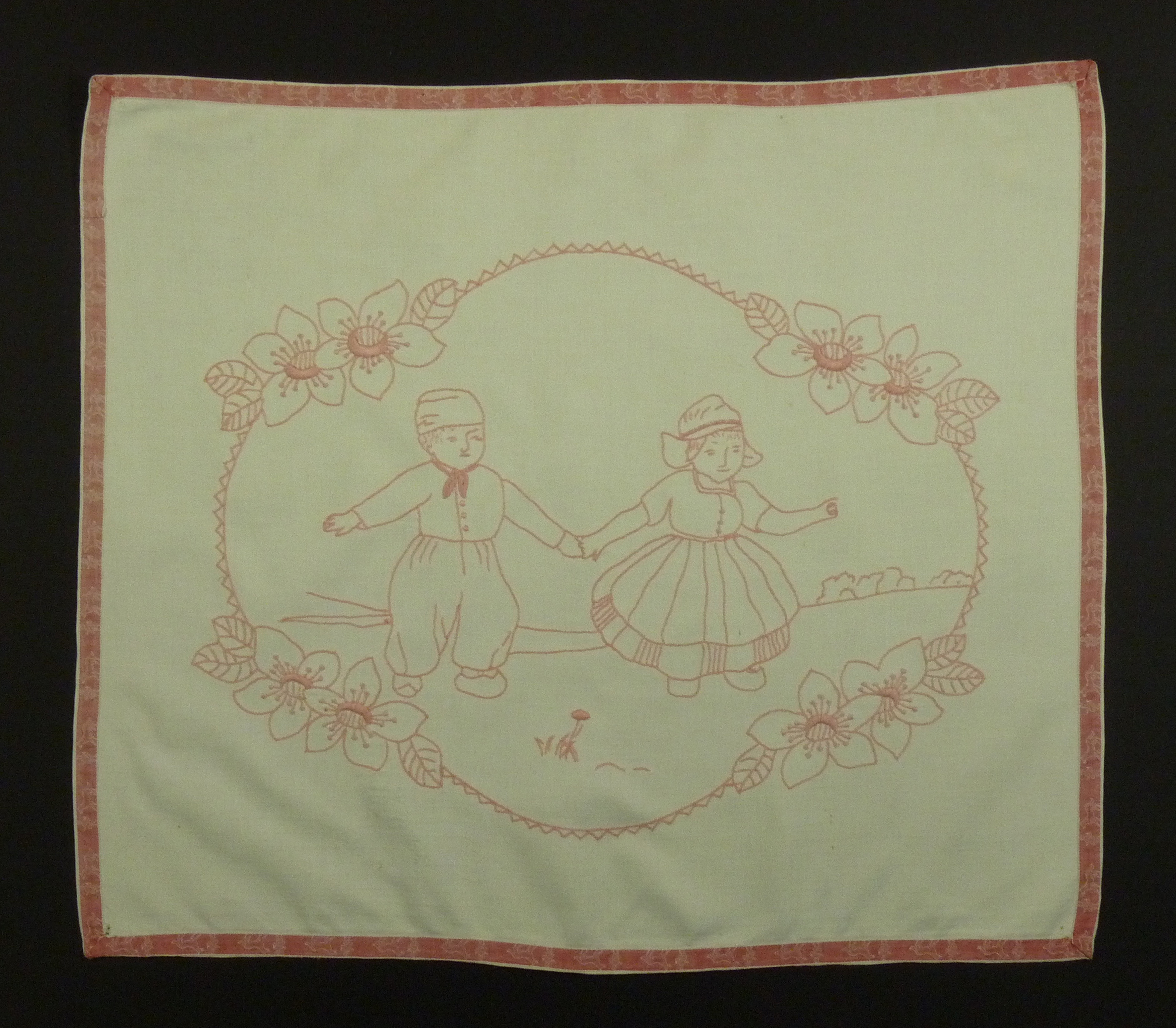 - Rosa bestickter Wandbehang, der mit einem rotem Zierband eingefasst ist. Das von Blumenranken umgebene Motiv zeigt eine Frau und einen Mann, die sich an den Händen halten.