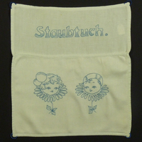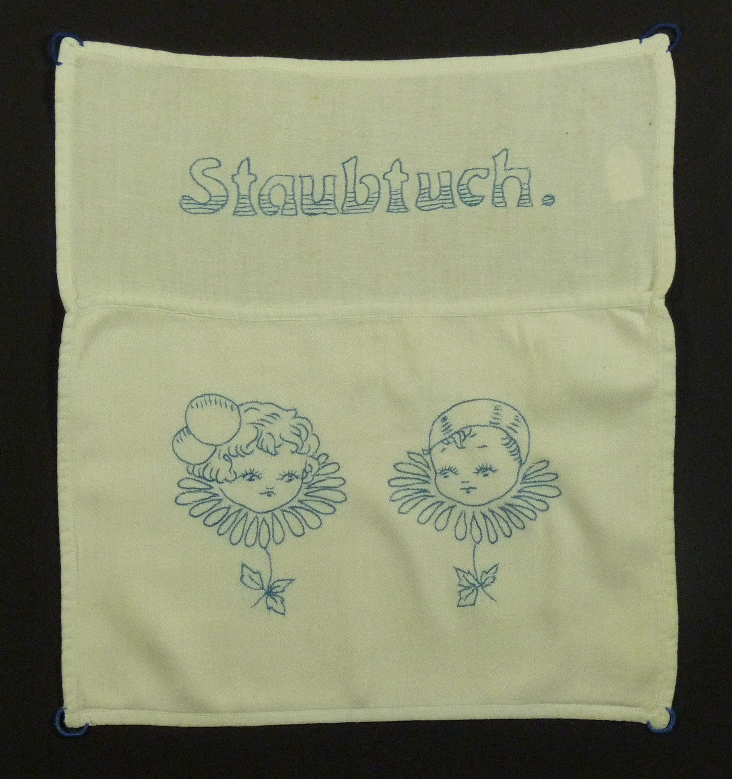 Blau bestickter Beutel für Staubtücher. In den Ecken sind gehäkelte Laschen um den Beutel aufzuhängen. In der oberen Hälfte steht "Staubtuch" und die untere Hälfte wird von zwei Kindergesichtern, die aus Blumen erwachsen, verziert.