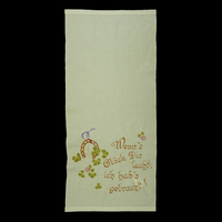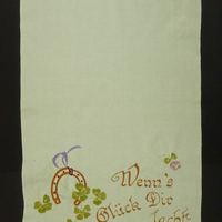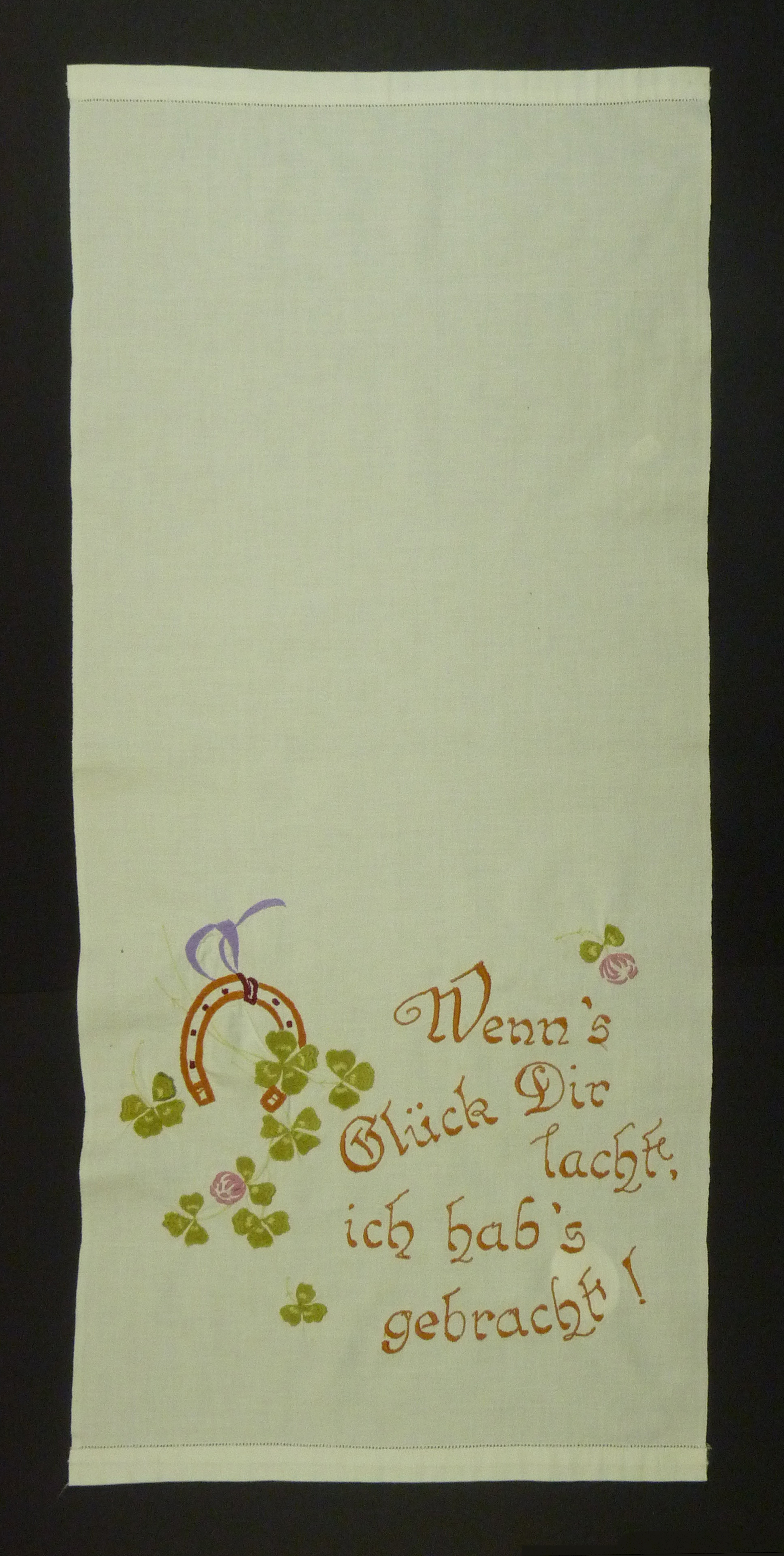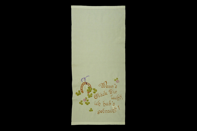 Mehrfarbiges, mit Plattstich besticktes Überhandtuch, das oben und unten mit Hohlsaum verziert ist. In der unteren Hälfte sind mehrere Motive: braune Hufeisen, grüner Klee, rosa und lila Blumen und der Spruch: "Wenn's / Glück dir / lacht, / ich hab's / gebracht!"