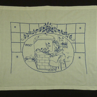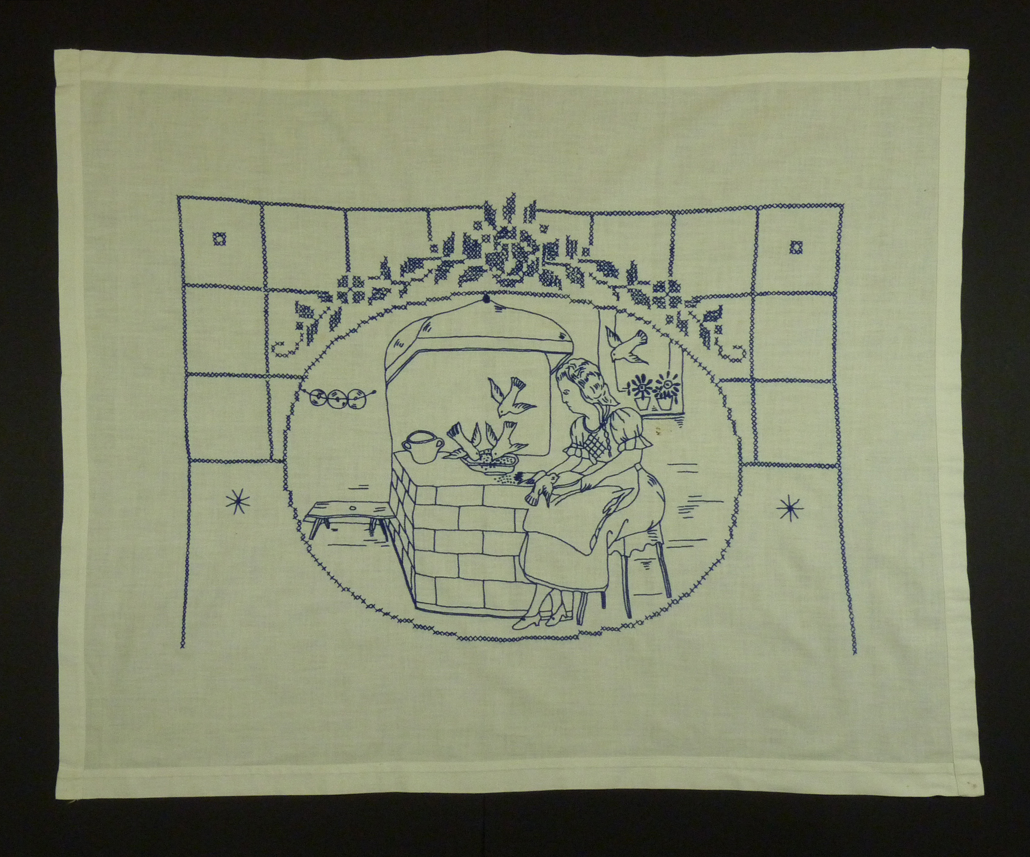 Blau bestickter Wandschoner. Die Motive sind mit Kreuzstich und Stielstich gearbeitet. Dargestellt ist Aschenputtel vor dem Herd sitzend und den Vögeln Körner gebend. Die gesamte Szene ist mit Verzierungen umrahmt.