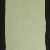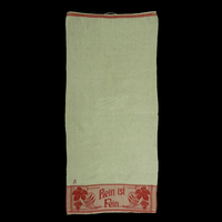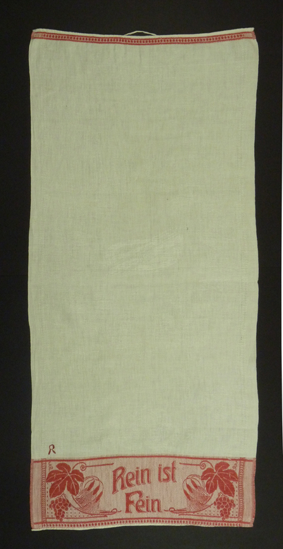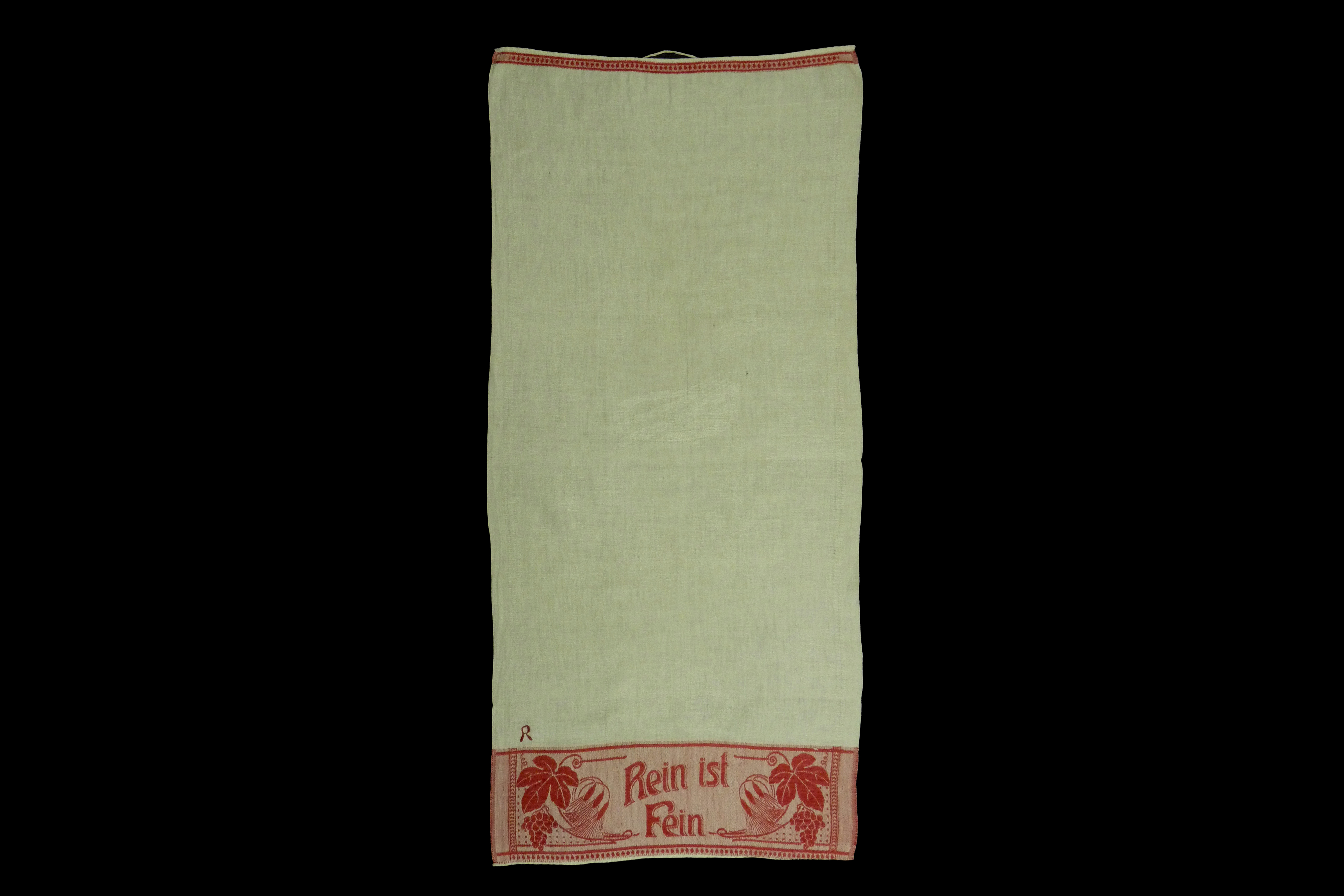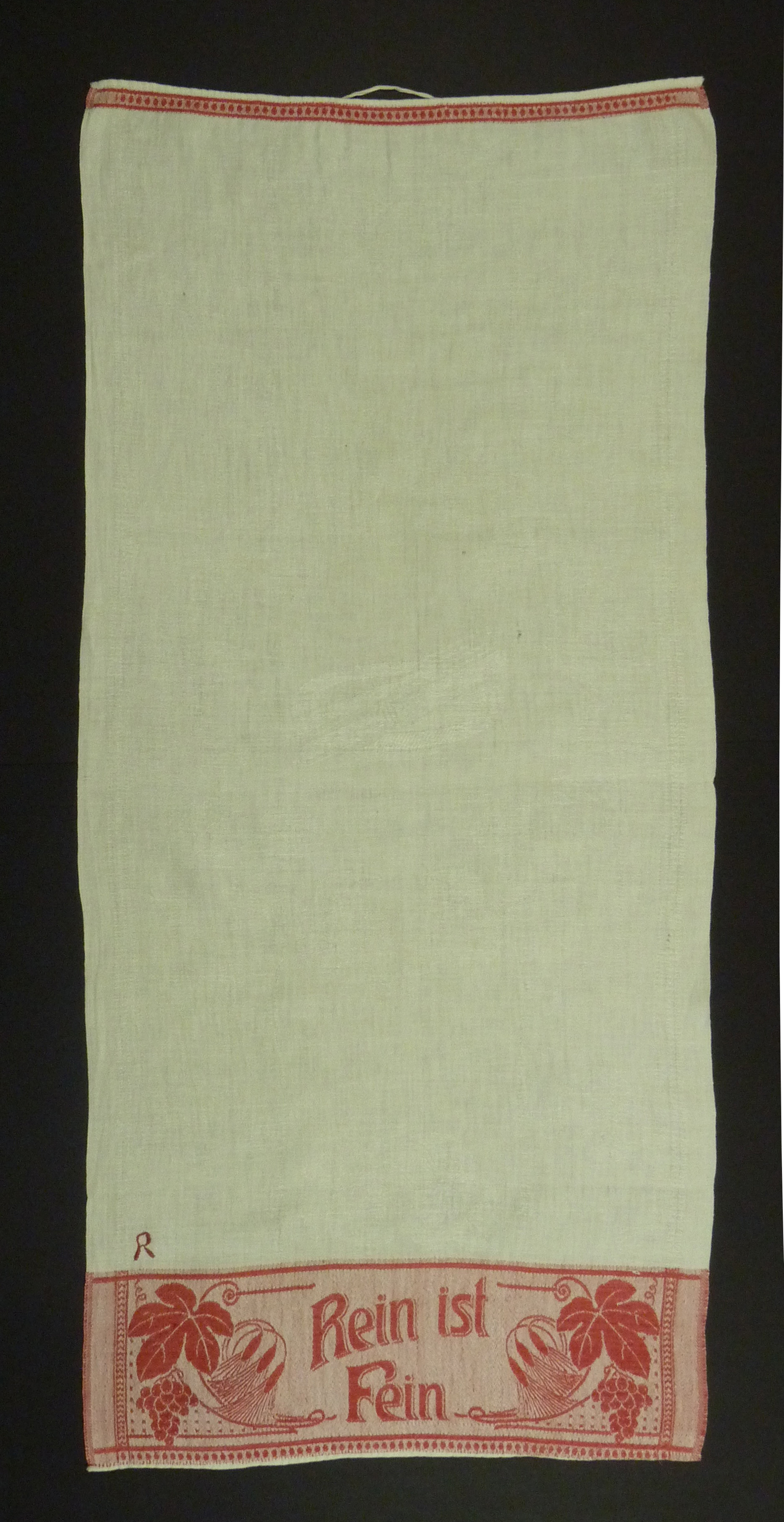 Gemustertes Tuch mit einem schmalen roten Zierstreifen oben und einem breiteren Zierstreifen unten. An der oberen Kante befindet sich eine Schlaufe zum Aufhängen. Am unteren Ende, vor dem Zierstreifen befindet sich die Initialie "R". Auf dem unteren Zierstreifen sind Weinreben und der Spruch: "Rein ist / Fein".