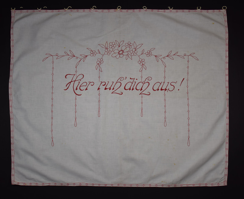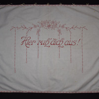Rot besticktes Spruchtuch, das mit einer Zierborte umrandet ist. An der Oberseite sind Ringe, um das Tuch aufzuhängen. Die Motive sind mit Stielstich und Plattstich gestickt. Dargestellt sind Blumenornamente, die den Spruch: "Hier ruh dich aus!" einrahmen.