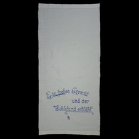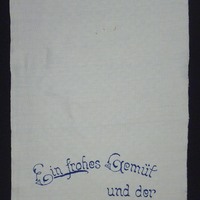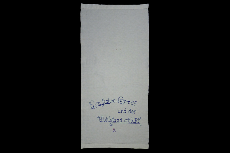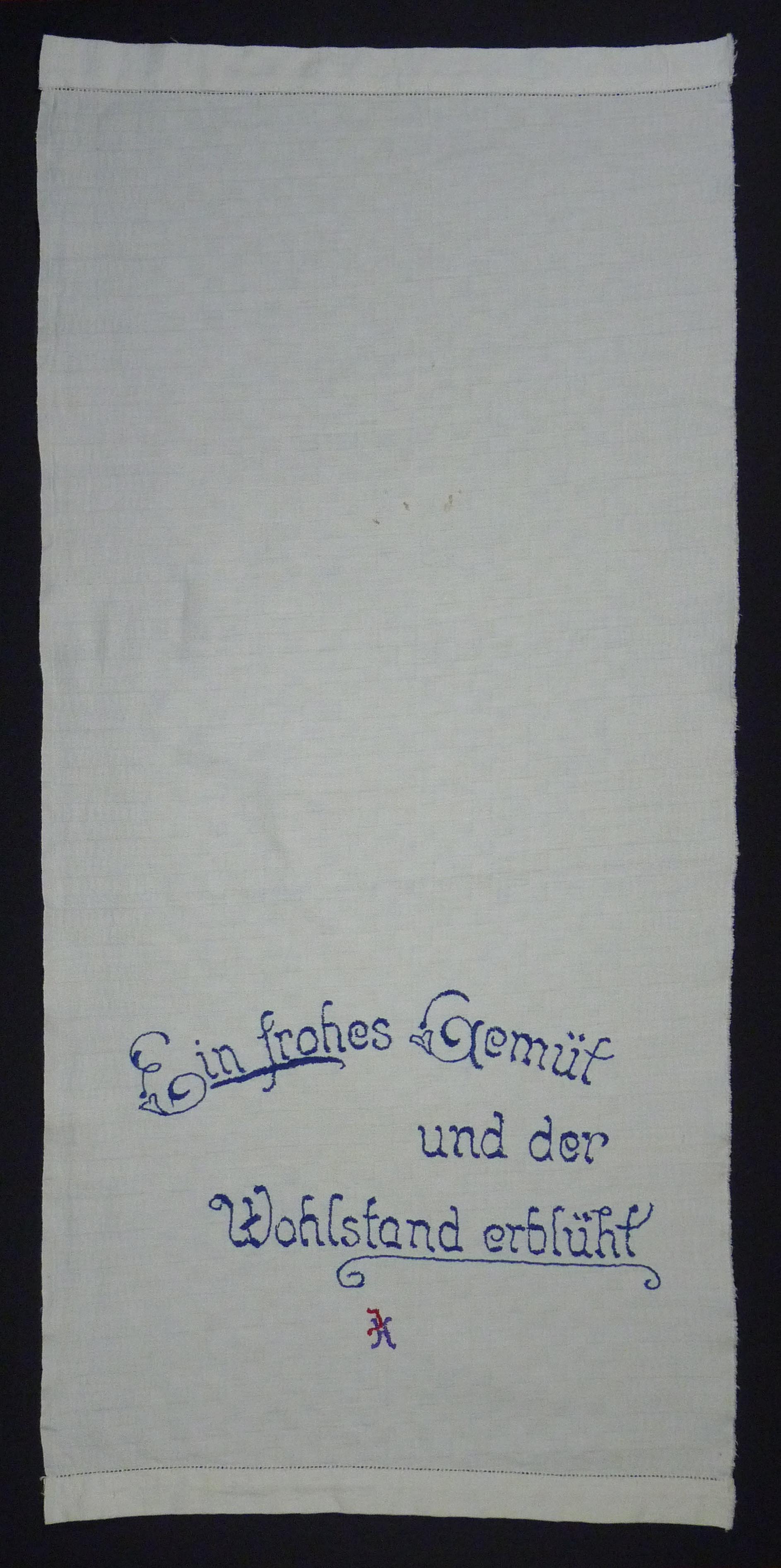 In der unteren Hälfte befindet sich der Spruch: "Ein frohes Gemüt / und der / Wohlstand erblüht". Unter dem Spruch sind die Initialen JH in Rot und Violett gestickt. - Umfang