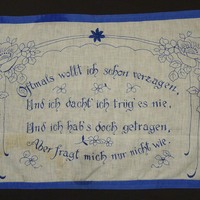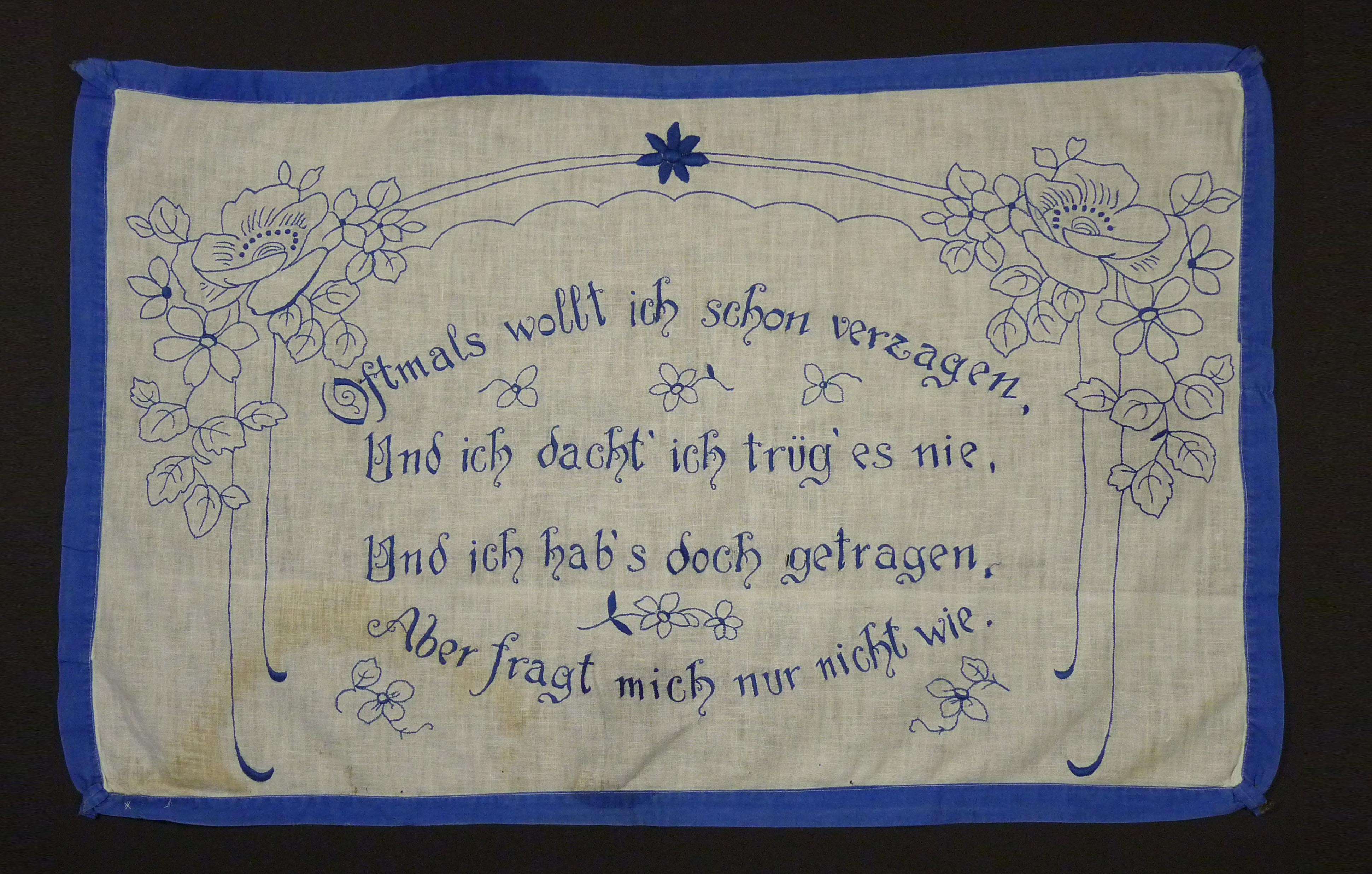 Blau besticktes Spruchtuch, das rundherum mit einem blauen Zierband eingefasst ist. Dargestellt sind Blumenornamente, die den Spruch einfassen. Spruch: "Oftmals wollt ich schon verzagen, / Und ich dacht' ich trüg' es nie, / Und ich hab's doch getragen. / Aber fragt mich nur nicht wie."