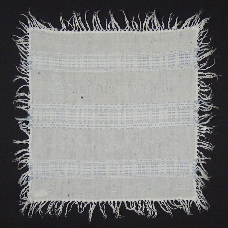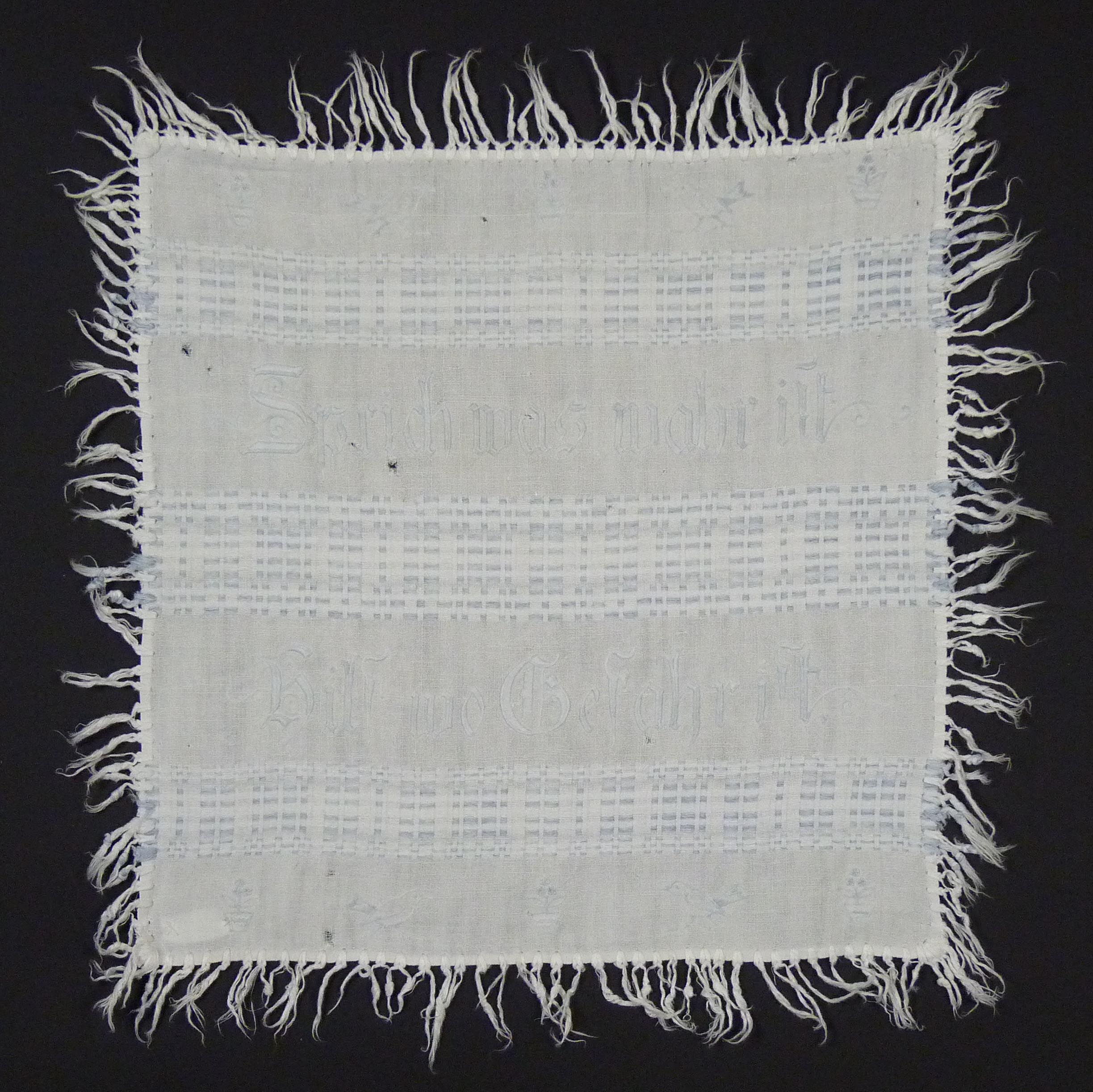Maschinenbesticktes Nachttisch-Deckchen, das rundherum mit Fransen eingefasst ist. Das Tuch wird von drei Querstreifen geteilt. Zwischen den Streifen sind mit hellblauem Faden, der verblichen ist, Motive wie Vögel und Blumentöpfe und der Spruch: "Sprich was wahr ist / Hilf, wo Gefahr ist." gestickt.