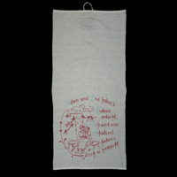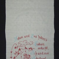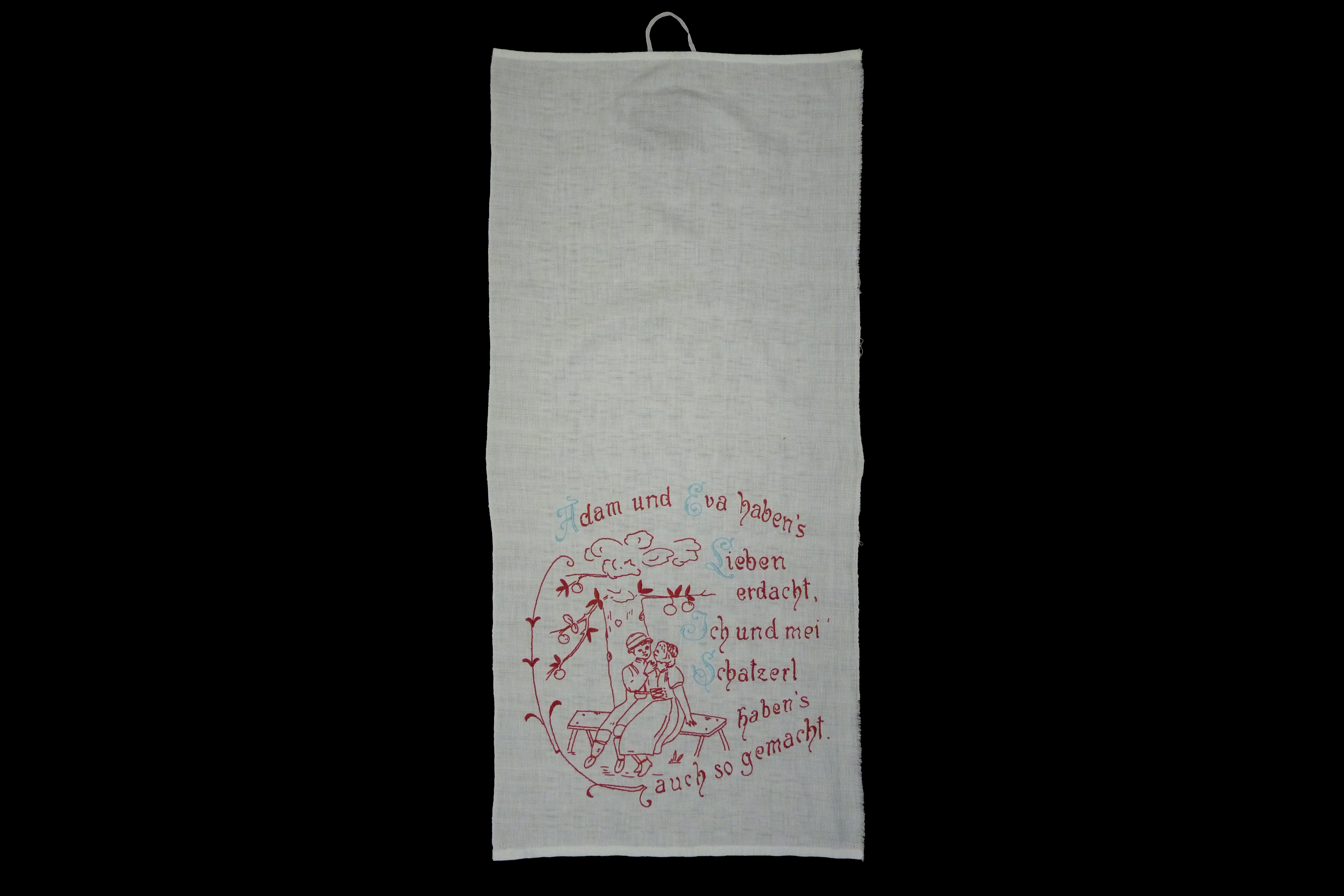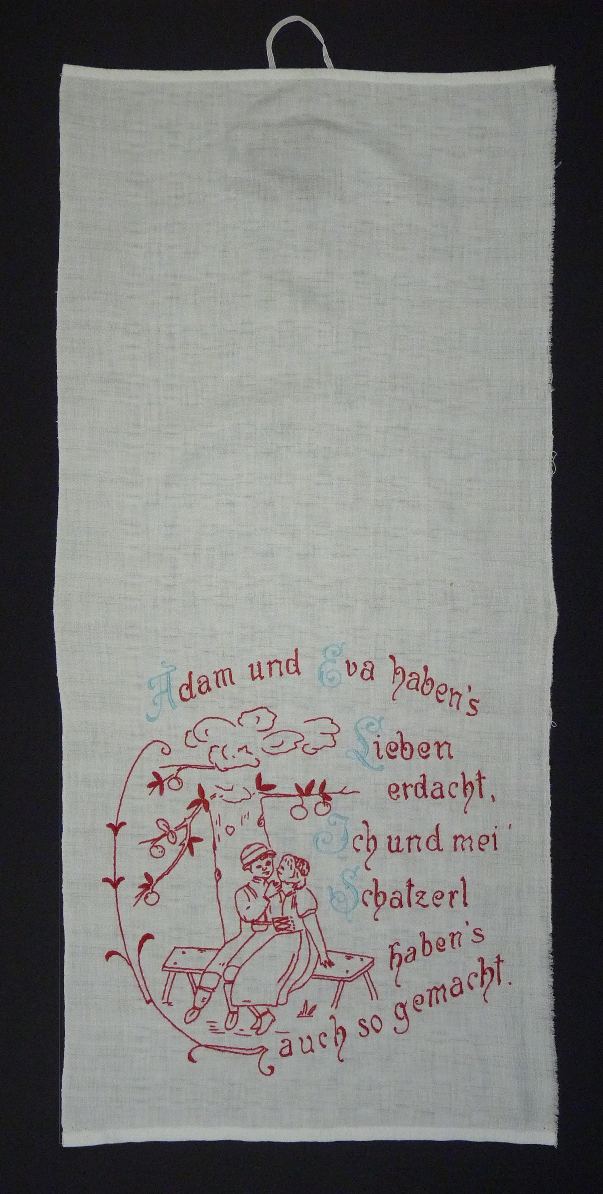 Rot besticktes Überhandtuch. An der Oberkante befindet sich eine Schlaufe. Die untere Hälfte ist bestickt. Das Motiv zeigt einen Jungen und ein Mädchen, die auf einer vor einem Baum stehenden Bank sitzen. Darüber und daneben steht der rote Spruch, Großbuchstaben in Hellblau: "Adam und Eva haben's / Lieben / erdacht, / ich und mei' / Schatzerl / haben's / auch so gemacht."