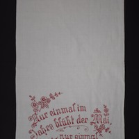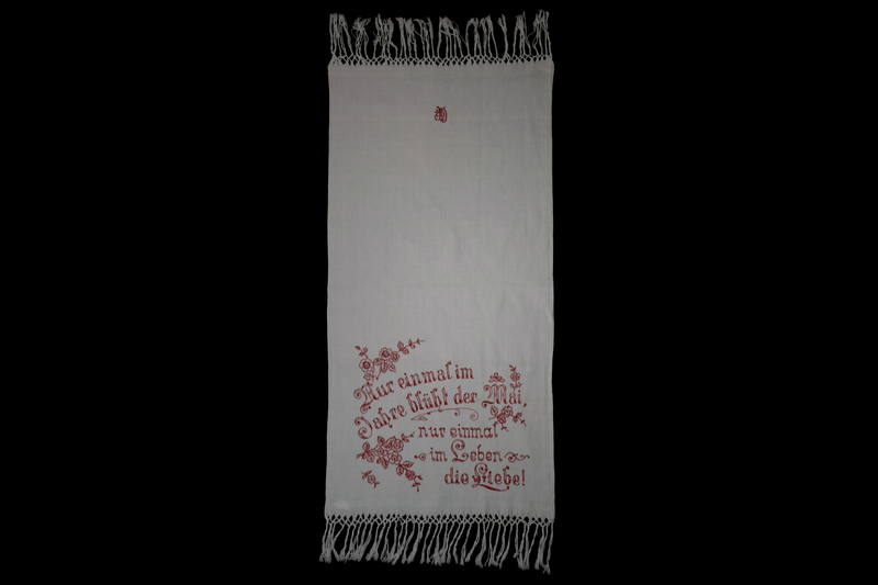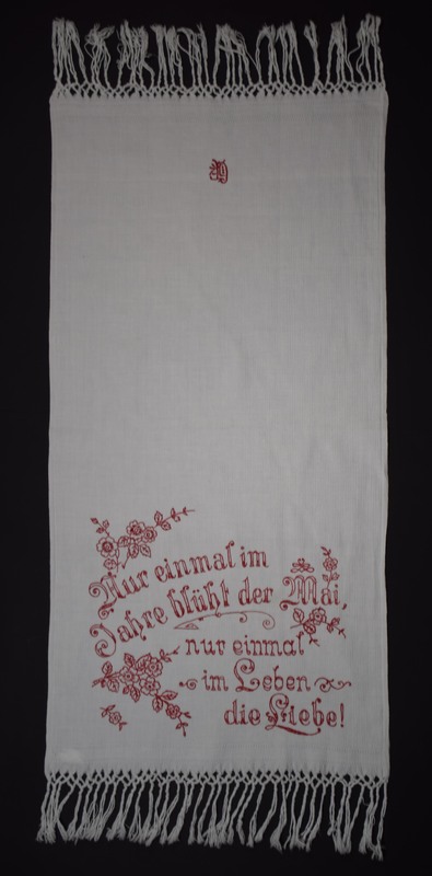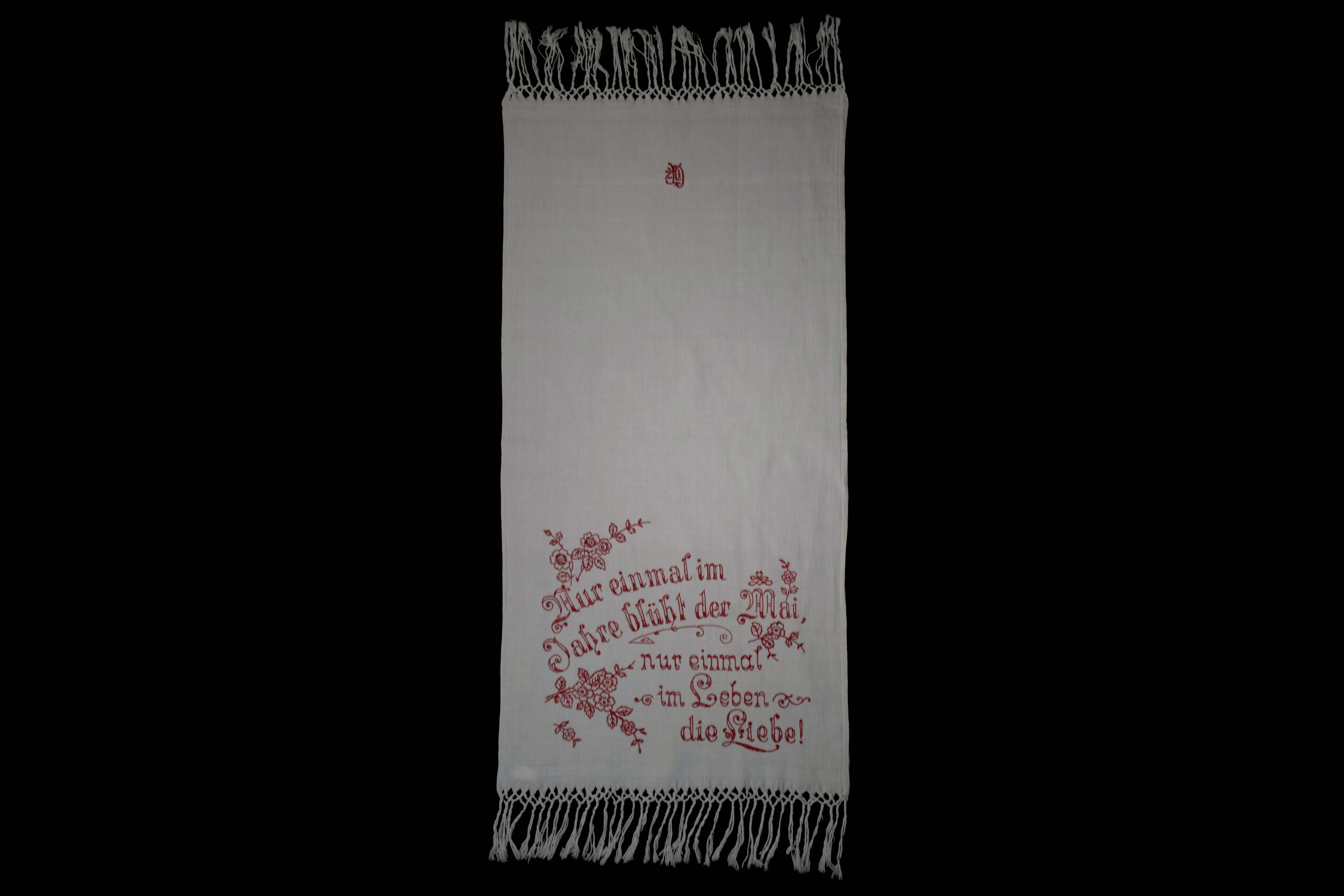 Mittig am oberen Rand sind die Initialen GF eingestickt. In der unteren Hälfte befinden sich Blumenranken und der Spruch: "Nur einmal im / Jahre blüht der Mai, / nur einmal / im Leben / die Liebe!" - Umfang