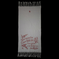 Rot besticktes Handtuch, das an der oberen und unteren Kante mit Fransen verziert ist.