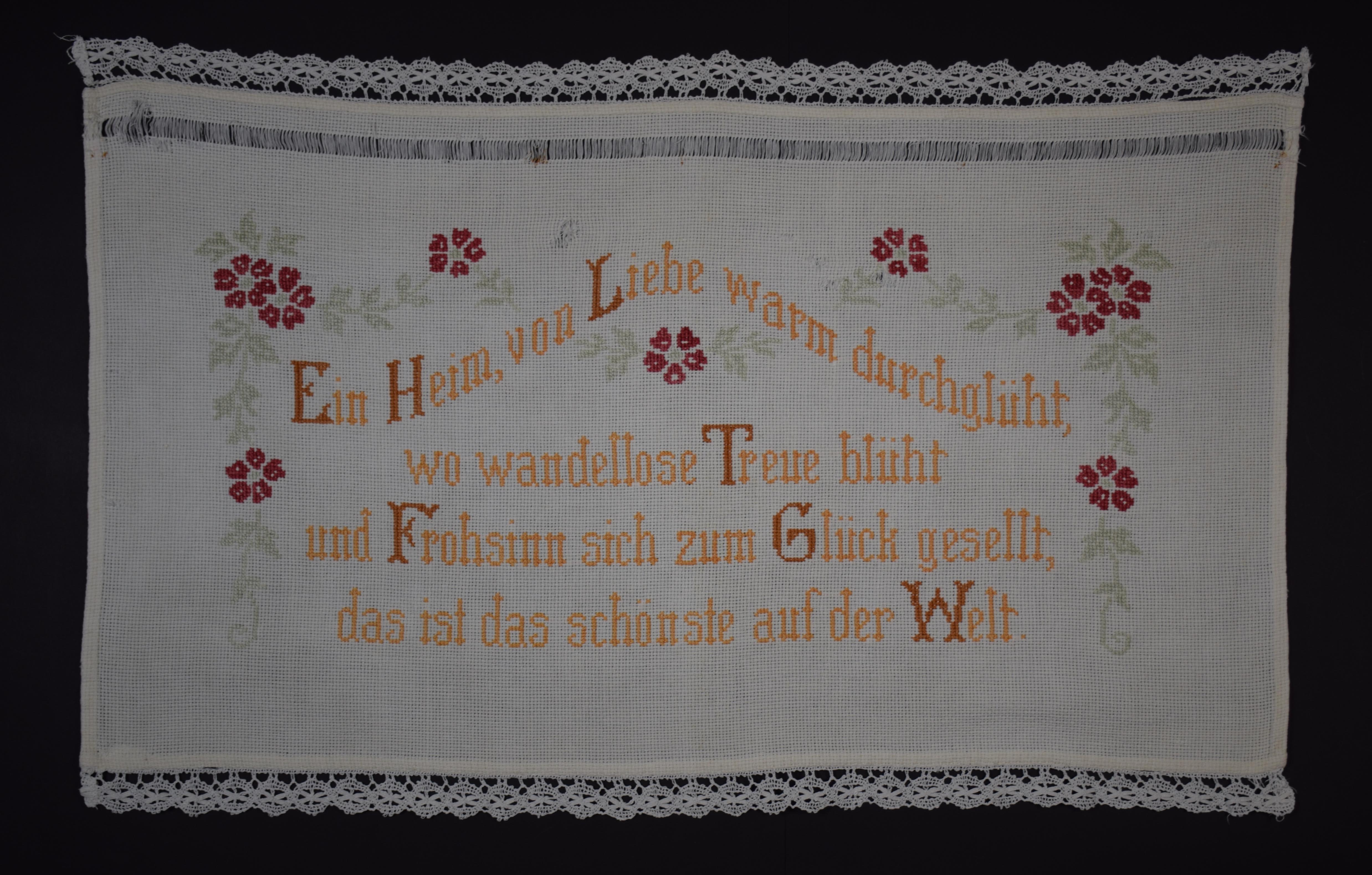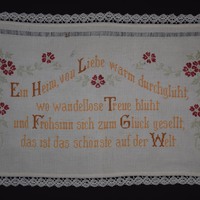 Spruchtuch, das an der oberen und unteren Kante mit Spitzen verziert ist. Die Motive sind mit gelbem, grünem und rotem Faden gestickt. Dargestellt sind Blumengirlanden, die einen Spruch einfassen. Die Großbuchstaben sind mit dunkelorangem Faden gearbeitet. Der Spruch lautet: "Ein Heim, von Liebe warm durchglüht, / wo wandellose Treue blüht / und Frohsinn sich zum Glück gesellt, / das ist das schönste auf der Welt."