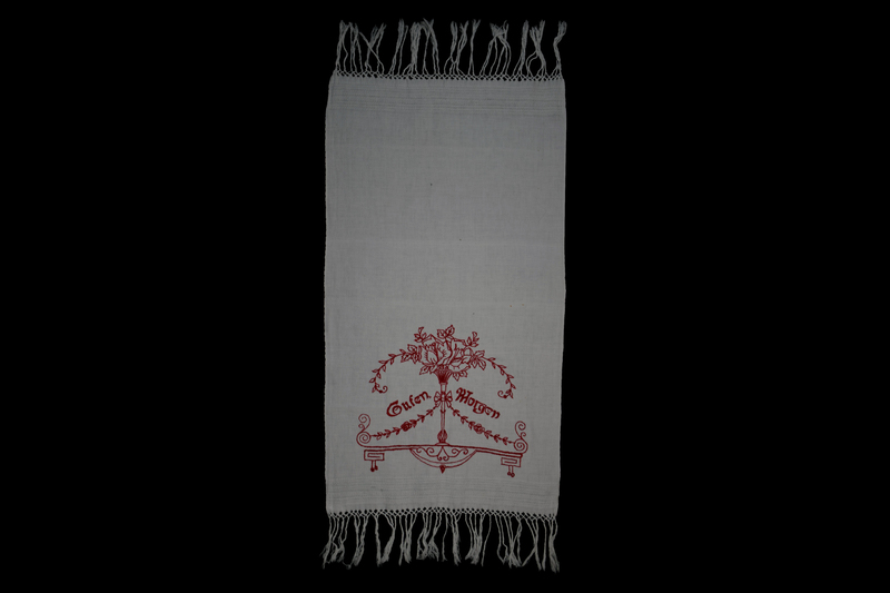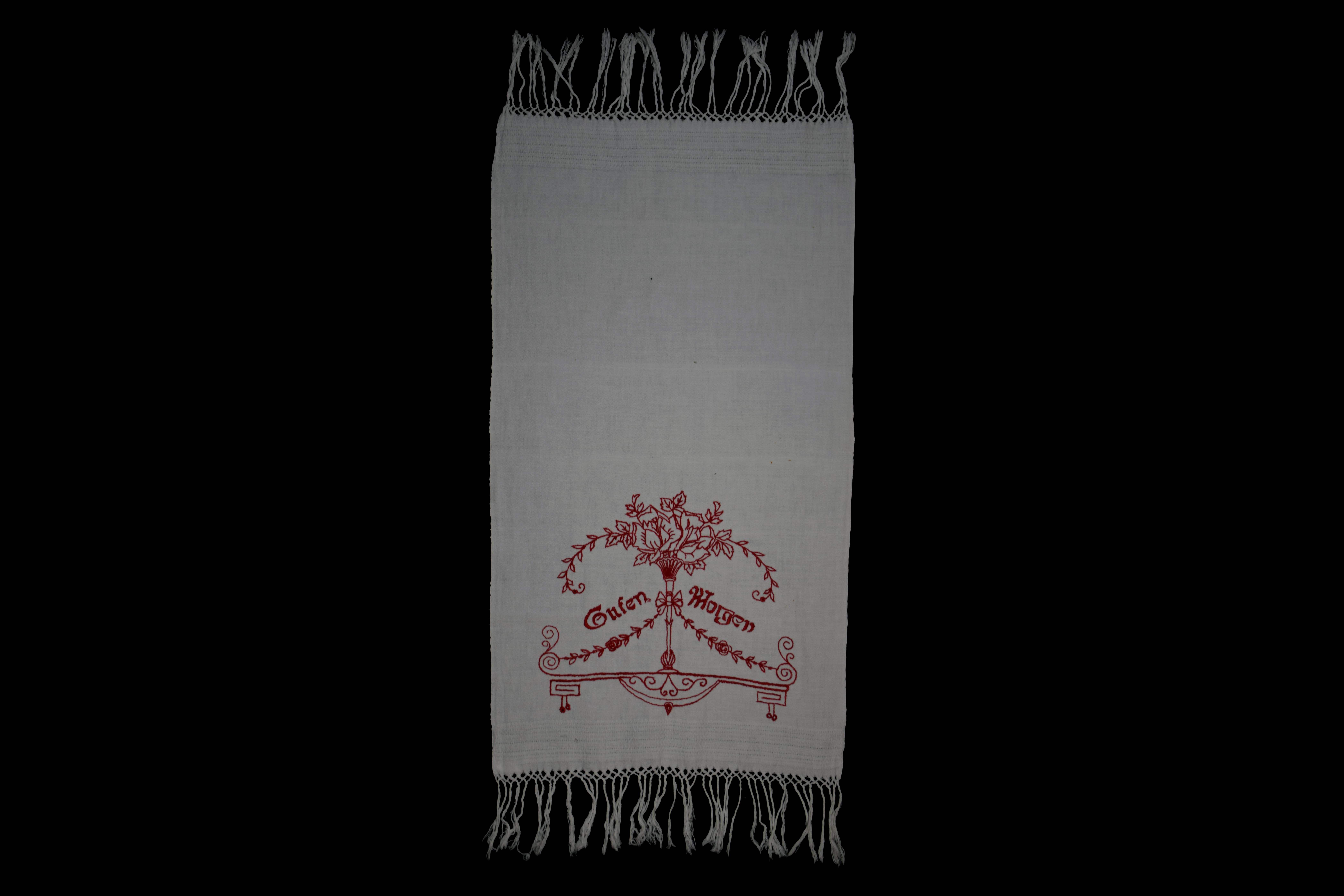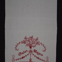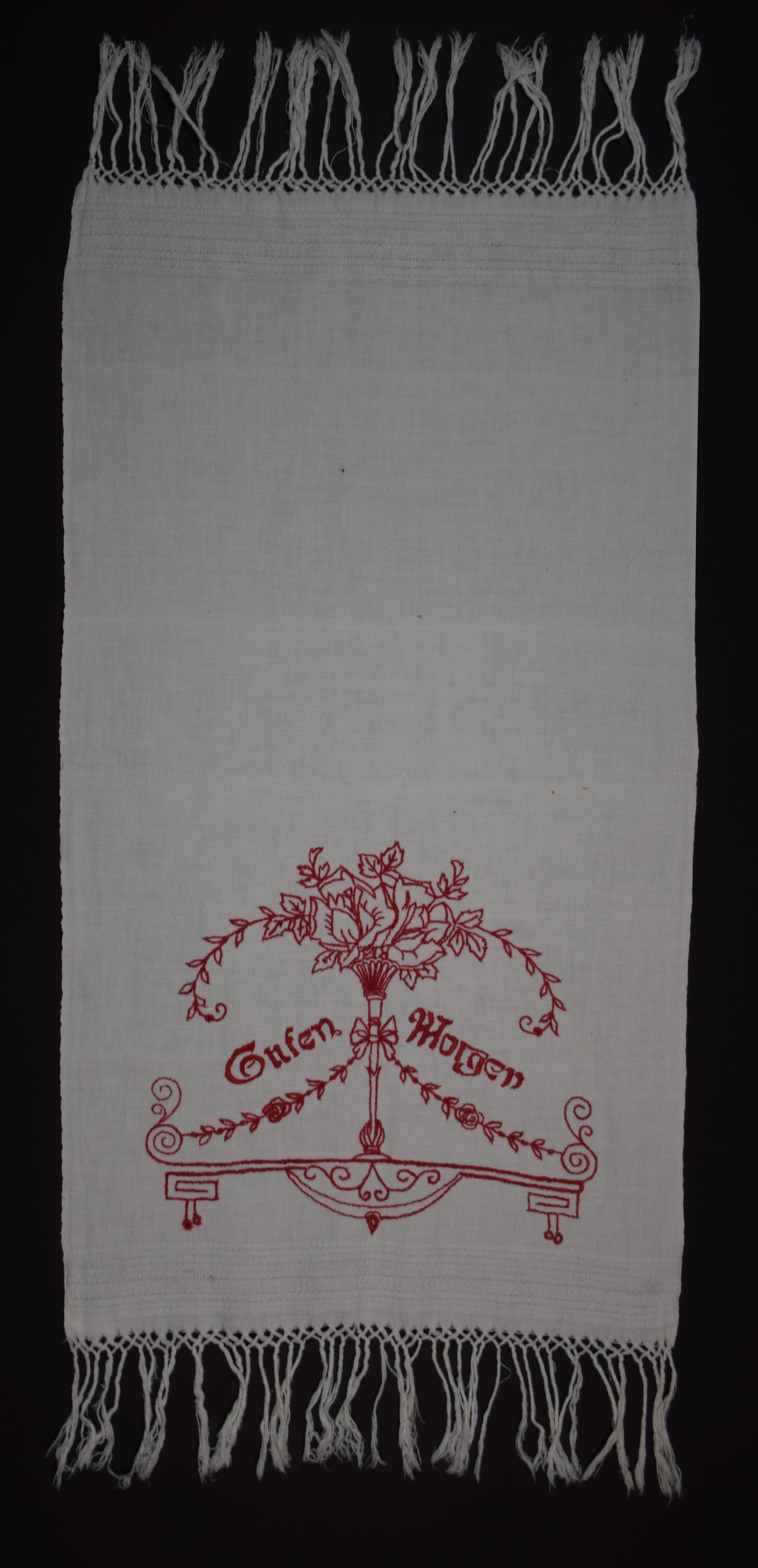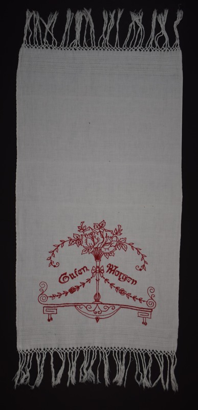 Rot besticktes Handtuch, das an der oberen und unteren Kante mit Fransen verziert ist. In die untere Hälfte ist das Motiv gestickt. Dargestellt ist eine verzierte Linie, auf der eine Vase mit einem langen Stiel steht. In dieser Vase befindet sich ein Blumenbouquet. Links und Rechts vom Stiel der Vase steht der Spruch: "Guten Morgen".