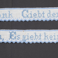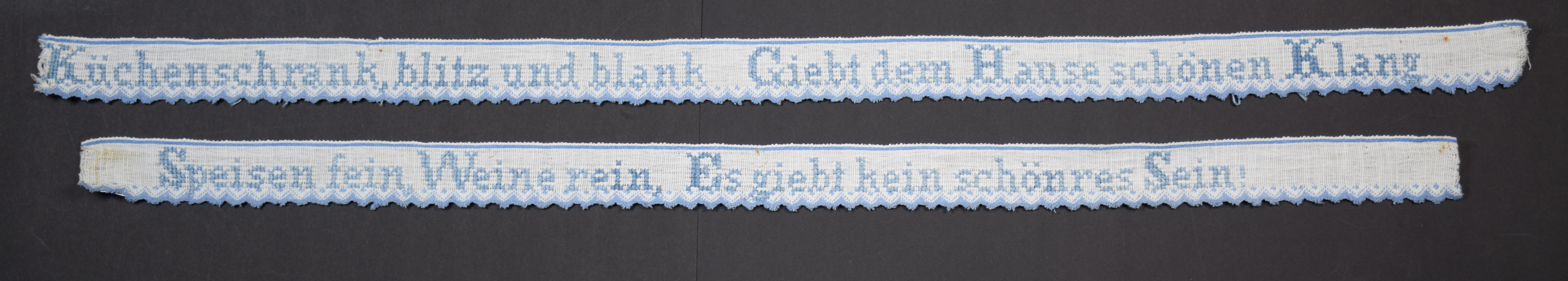 Beide sind blau bestickt mit Kreuzstich und mit maschineller Spitze verziert.