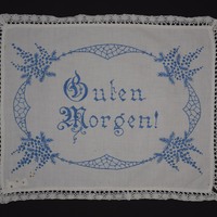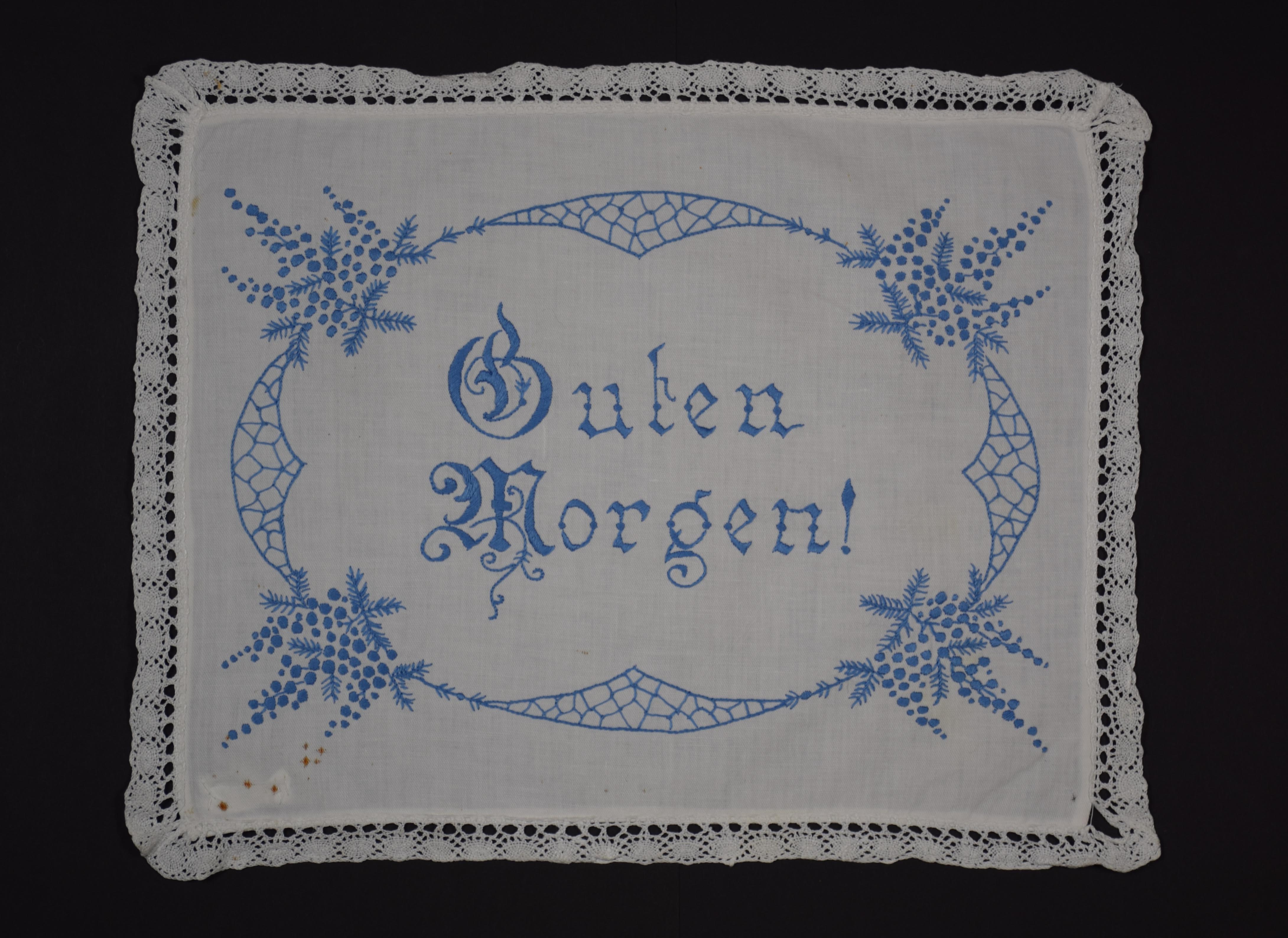 - Blau bestickte Zierdecke für den Nachttisch. Die gesamte Decke wird von Spitze eingefasst. Die Stickereien wurden mit Plattstich gearbeitet. Dargestellt ist ein Spruch, der von einem floralen Ornament eingerahmt ist. Der Spruch lautet: "Guten / Morgen!"