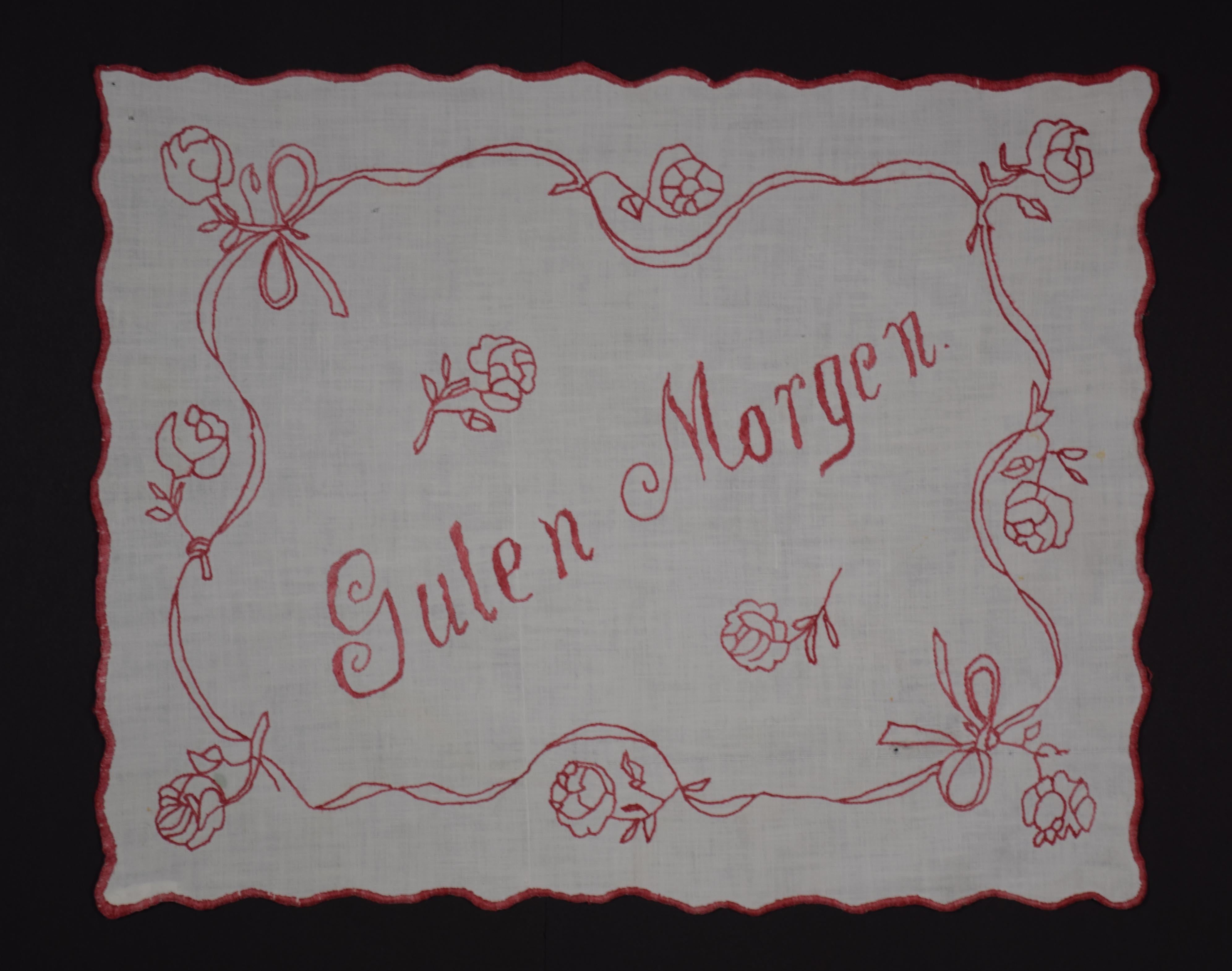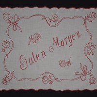 - Rot besticktes Nachttischdeckchen, das mit Schlingstich umrandet ist. Die Motive sind mit Stiel- und Plattstich gearbeitet. Dargestellt sind Blumenornamente, die den Spruch "Guten Morgen." umrahmen.