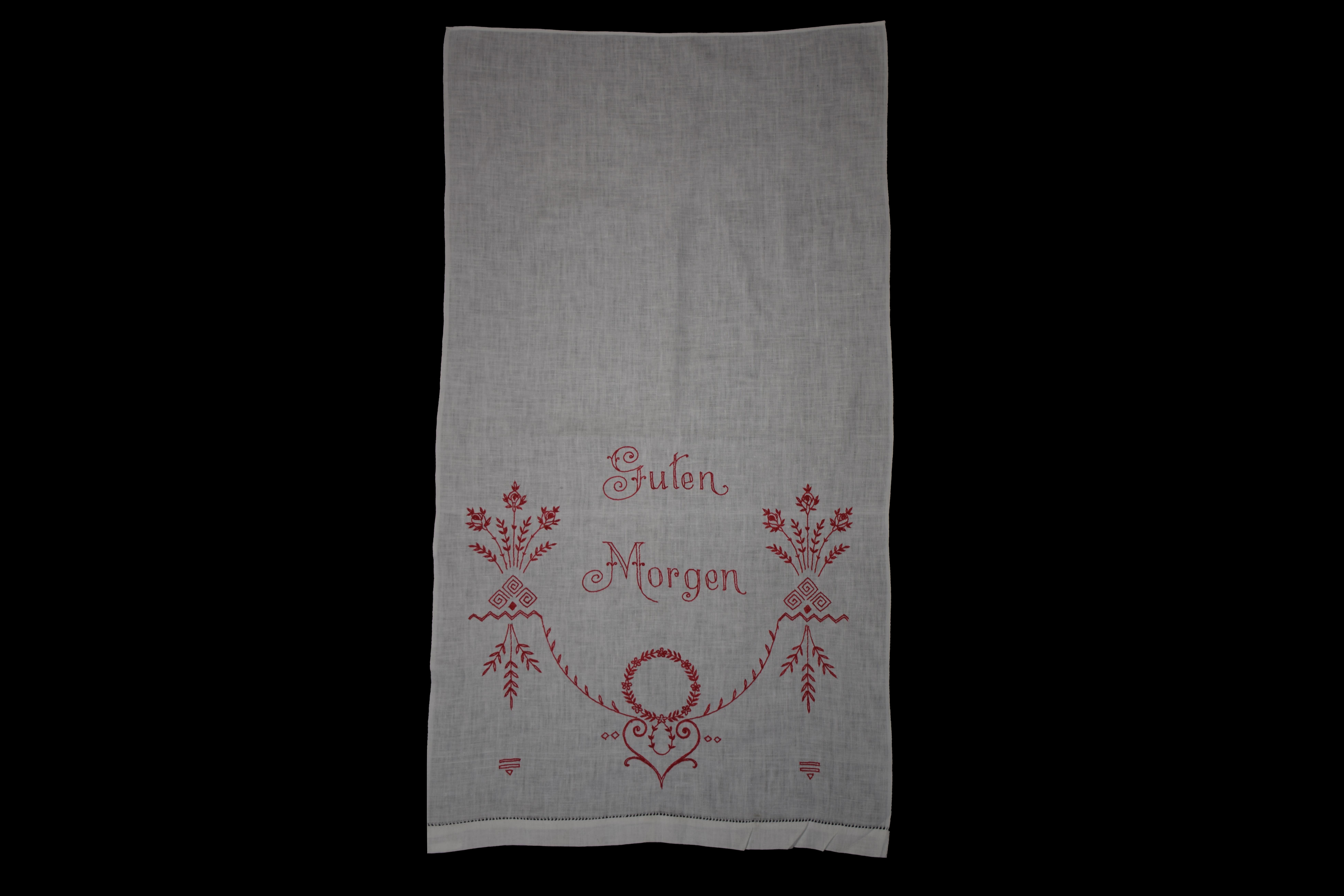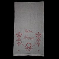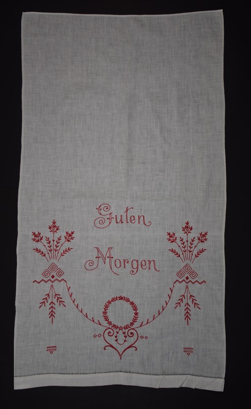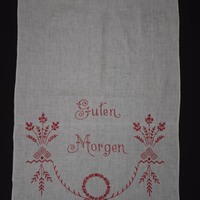 - Rot besticktes Überhandtuch. Dargestellt sind auf der unteren Hälfte Ornamente und Blumen, die den Spruch: "Guten / Morgen" rahmen.