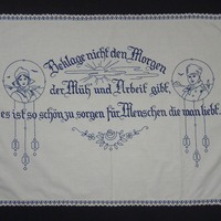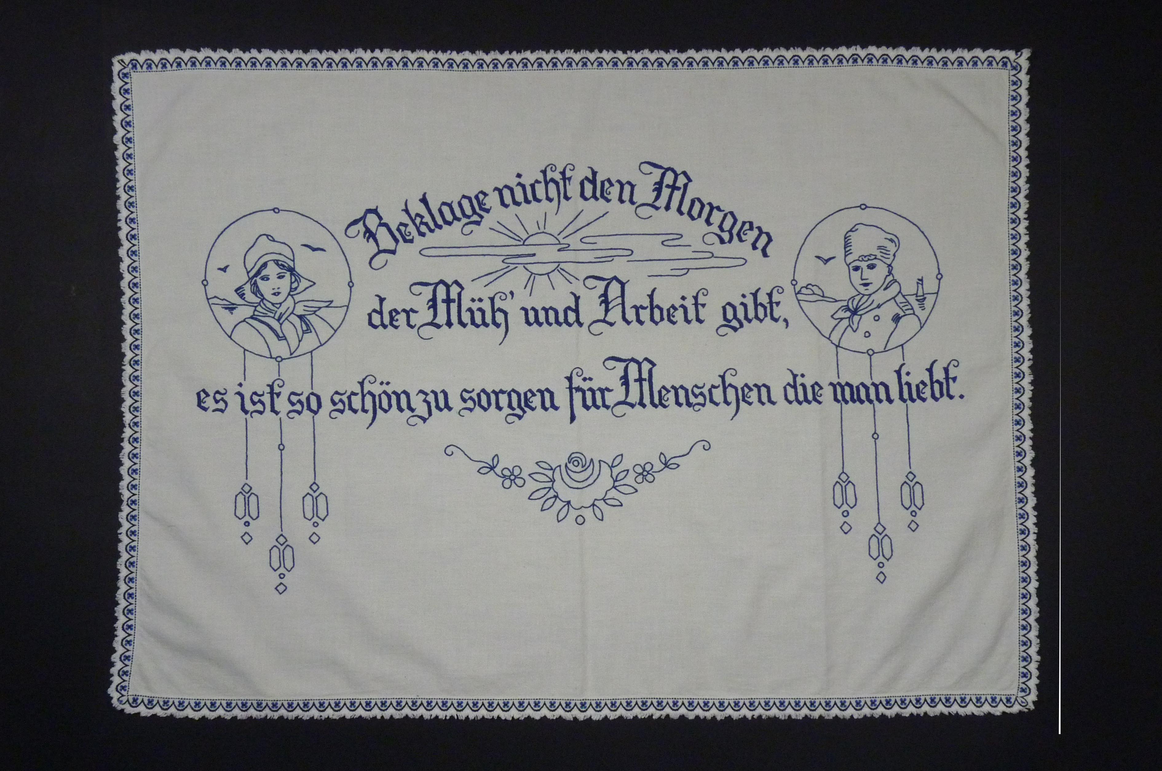 Blau besticktes Spruchtuch, das von einer schwarz, blauen mit Blumen dekorierten Zierborte umrahmt wird. In der Mitte des Tuches befindet sich ein Spruch, der auf beiden Seiten jeweils von einem Tondo begrenzt wird. Der rechte Tondo zeigt eine Frau und der linke einen Mann. Weiters finden sich noch mittig eine Sonne und Blumenornamente, die den Spruch umgeben. Der Spruch lautet: "Beklage nicht den Morgen / der Müh' und Arbeit gibt, / es ist so schön zu sorgen für Menschen die man liebt."